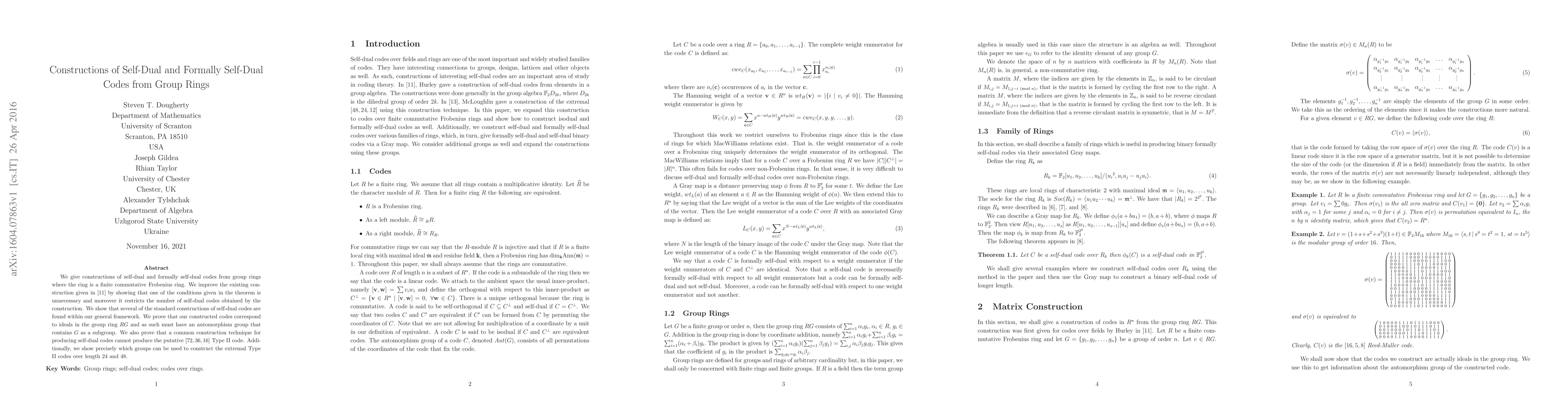 This paper constructs self-dual and formally self-dual codes from group rings over finite commutative Frobenius rings, improving upon previous methods by eliminating unnecessary conditions and identifying which groups can produce extremal Type II codes. The authors prove that their constructed codes are ideals in the group ring and have an automorphism group containing the group $G$.