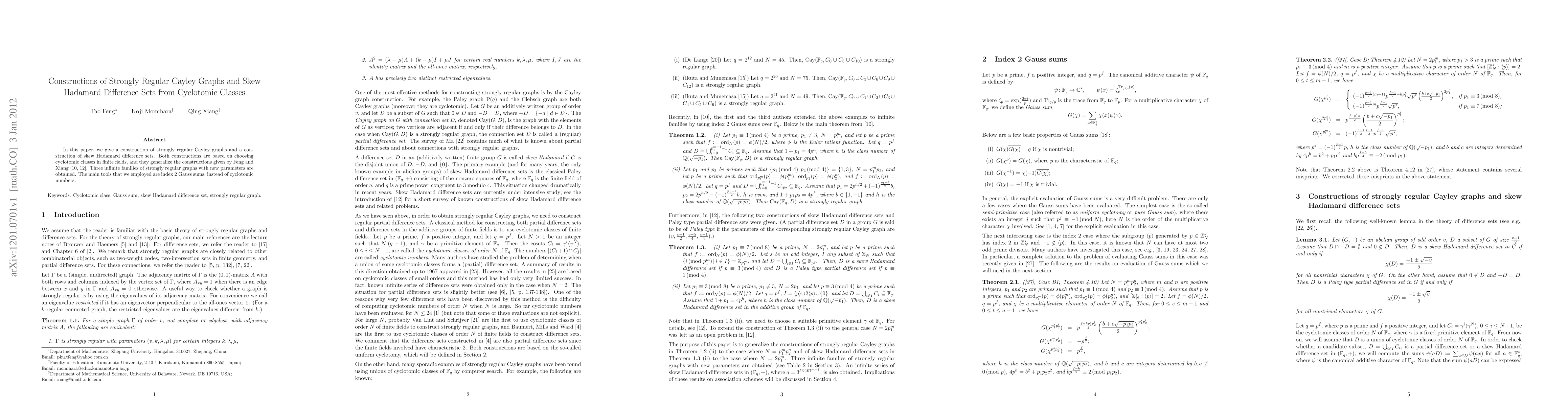 This paper constructs strongly regular Cayley graphs and skew Hadamard difference sets using cyclotomic classes in finite fields, generalizing previous constructions. It introduces three new infinite families of strongly regular graphs and employs index 2 Gauss sums as the main tool.