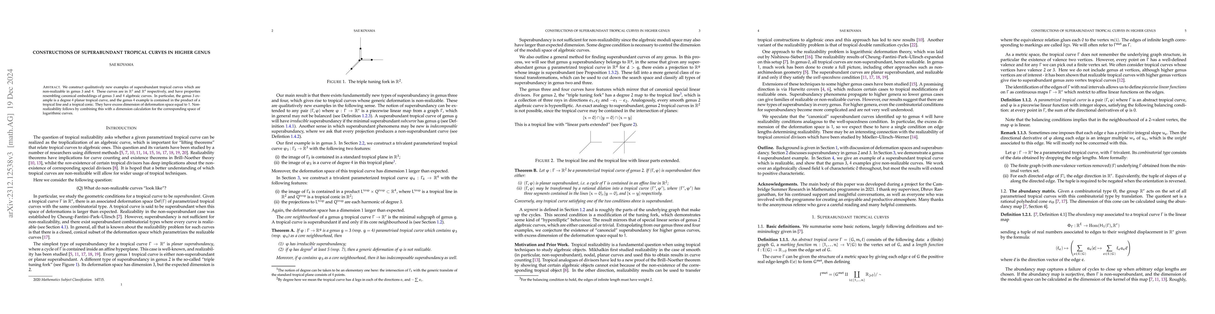This paper constructs new examples of superabundant tropical curves in $\mathbb{R}^3$ and $\mathbb{R}^4$ for genus $3$ and $4$, respectively, which cannot be realized traditionally due to their excess deformation dimension. The genus $3$ example is a degree $4$ planar curve, while the genus $4$ example lies in a product of a tropical line and conic.