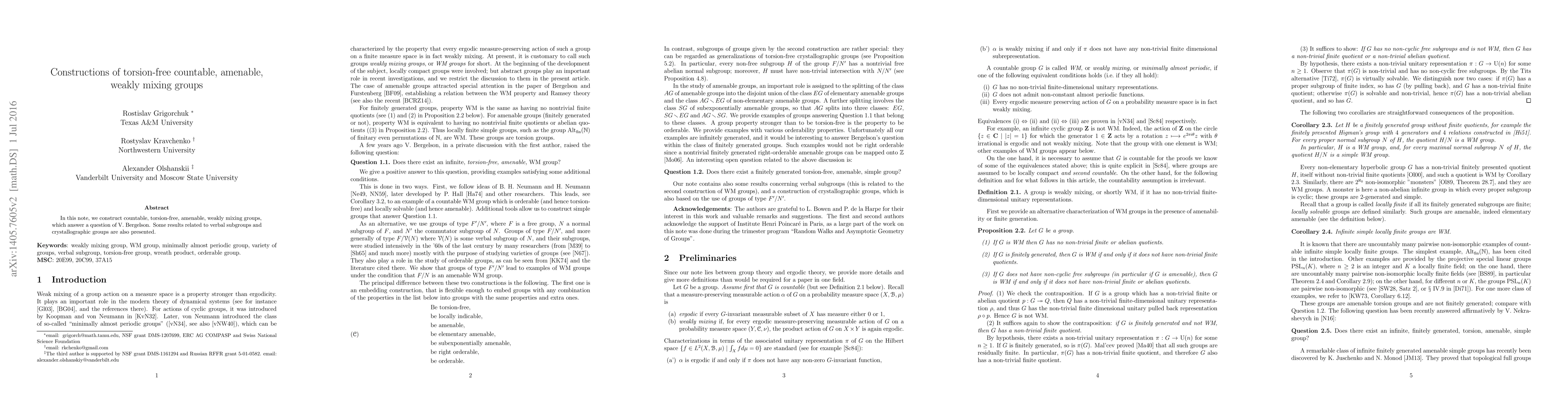 This paper constructs torsion-free countable, amenable, weakly mixing groups, addressing a question posed by V. Bergelson, and includes findings on verbal subgroups and crystallographic groups. The constructions provide new insights into the structure of such groups.
