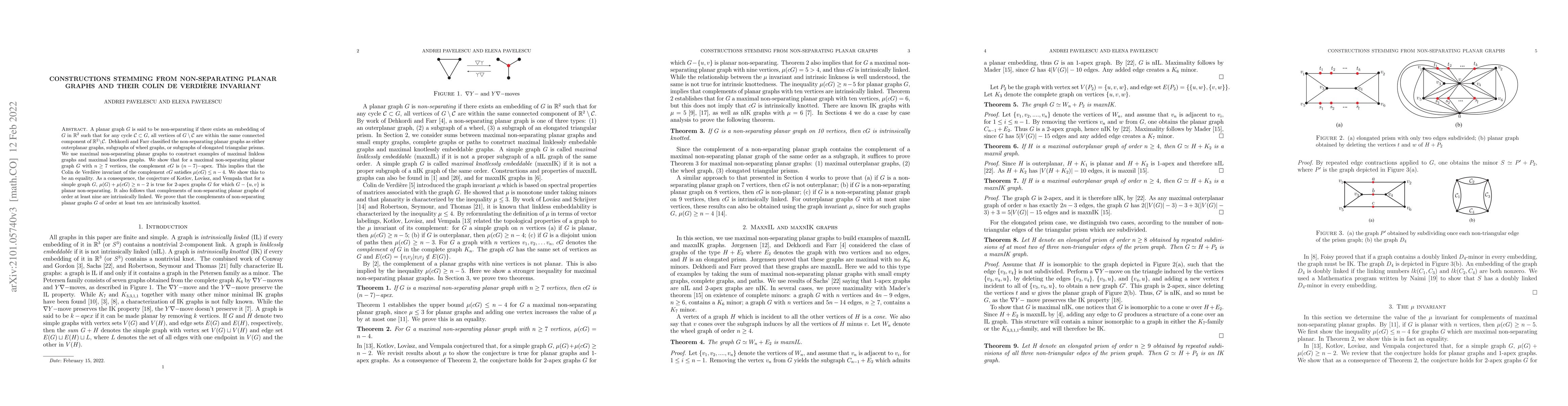 This paper classifies maximal non-separating planar graphs and constructs maximal linkless and knotless graphs from them. It demonstrates that for such graphs, the Colin de Verdière invariant of their complements equals $n-4$ for $n \geq 7$, proving the conjecture of Kotlov, Lovász, and Vempala for specific 2-apex graphs. It also concludes that complements of non-separating planar graphs of order at least nine are intrinsically linked and those of order at least ten are intrinsically knotted.