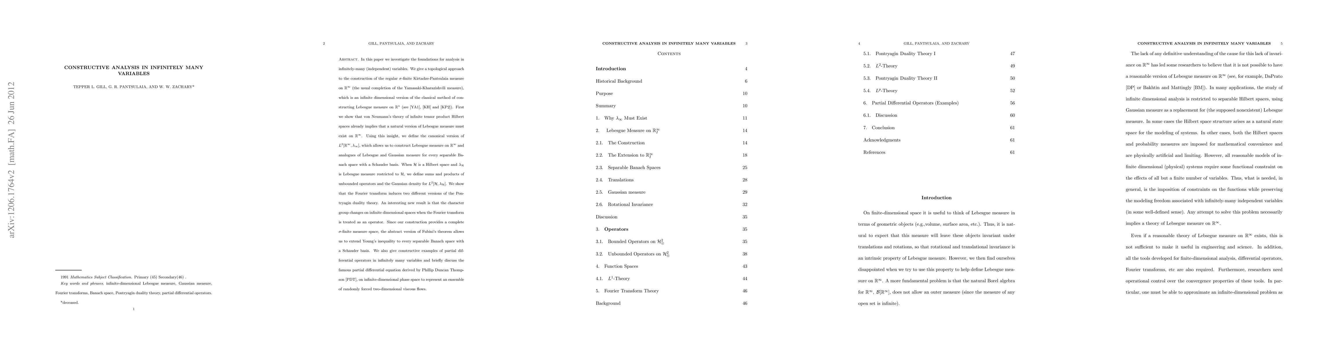 In this paper we investigate the foundations for analysis in infinitely-many (independent) variables. We give a topological approach to the construction of the regular $\s$-finite Kirtadze-Pantsulaia measure on $\R^\iy$ (the usual completion of the Yamasaki-Kharazishvili measure), which is an infinite dimensional version of the classical method of constructing Lebesgue measure on $\R^n$ (see \cite{YA1}, \cite{KH} and \cite{KP2}). First we show that von Neumann's theory of infinite tensor product Hilbert spaces already implies that a natural version of Lebesgue measure must exist on $\R^{\iy}$. Using this insight, we define the canonical version of $L^2[\R^{\iy}, \la_{\iy}]$, which allows us to construct Lebesgue measure on $\R^{\iy}$ and analogues of Lebesgue and Gaussian measure for every separable Banach space with a Schauder basis. When $\mcH$ is a Hilbert space and $\la_{\mcH}$ is Lebesgue measure restricted to $\mcH$, we define sums and products of unbounded operators and the Gaussian density for $L^2[\mcH, \la_{\mcH}]$. We show that the Fourier transform induces two different versions of the Pontryagin duality theory. An interesting new result is that the character group changes on infinite dimensional spaces when the Fourier transform is treated as an operator. Since our construction provides a complete $\s$-finite measure space, the abstract version of Fubini's theorem allows us to extend Young's inequality to every separable Banach space with a Schauder basis. We also give constructive examples of partial differential operators in infinitely many variables and briefly discuss the famous partial differential equation derived by Phillip Duncan Thompson \cite{PDT}, on infinite-dimensional phase space to represent an ensemble of randomly forced two-dimensional viscous flows.