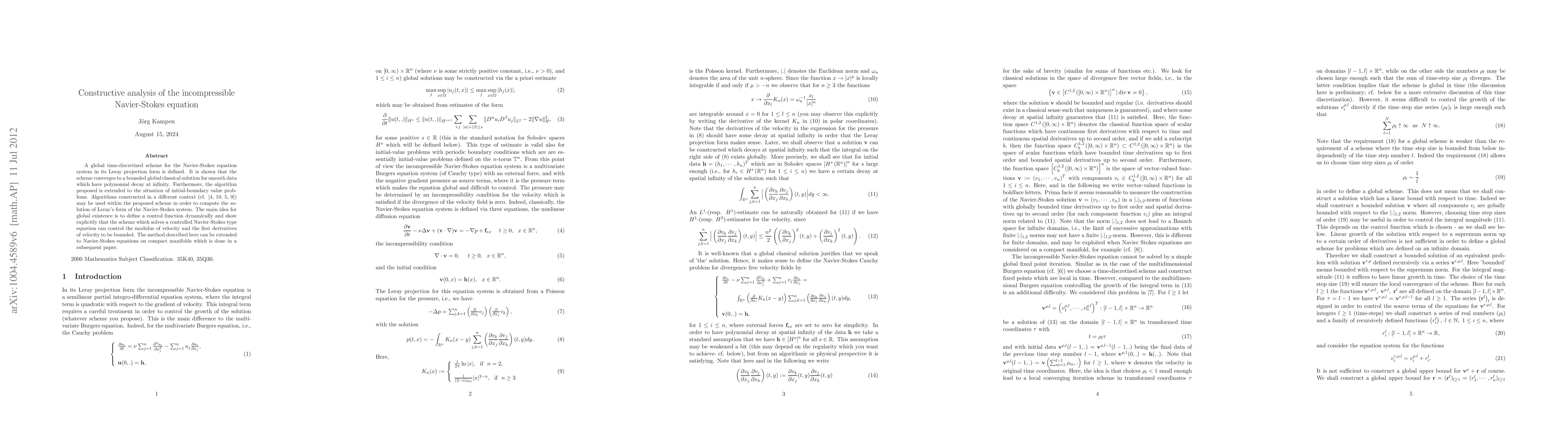 A global time-discretized scheme for the Navier-Stokes equation system in its Leray projection form is defined. It is shown that the scheme converges to a bounded global classical solution for smooth data which have polynomial decay at infinity. Furthermore, the algorithm proposed is extended to the situation of initial-boundary value problems. Algorithms constructed in a different context (cf. [4, 10, 5, 9]) may be used within the proposed scheme in order to compute the solution of Leray's form of the Navier-Stokes system. The main idea for global existence is to define a control function dynamically and show explicitly that the scheme which solves a controlled Navier-Stokes type equation can control the modulus of velocity and the first derivatives of velocity to be bounded. The method described here can be extended to Navier-Stokes equations on compact manifolds which is done in a subsequent paper.