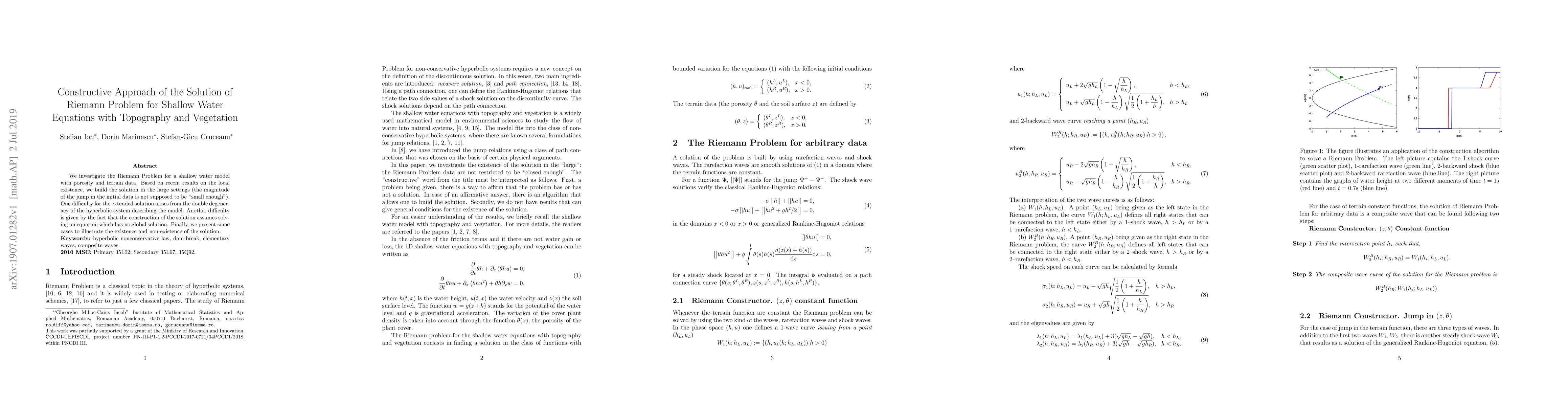 Researchers developed a method to solve a complex mathematical problem involving shallow water equations with topography and vegetation, addressing challenges related to degeneracy and the existence of solutions in large settings.