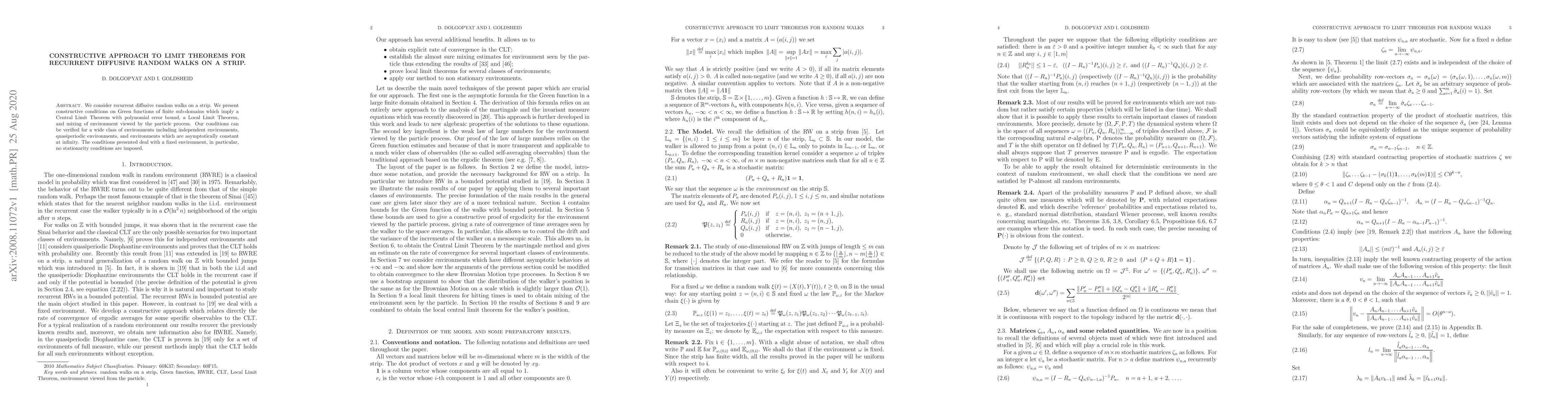 We consider recurrent diffusive random walks on a strip. We present constructive conditions on Green functions of finite sub-domains which imply a Central Limit Theorem with polynomial error bound, a Local Limit Theorem, and mixing of environment viewed by the particle process. Our conditions can be verified for a wide class of environments including independent environments, quasiperiodic environments, and environments which are asymptotically constant at infinity. The conditions presented deal with a fixed environment, in particular, no stationarity conditions are imposed.