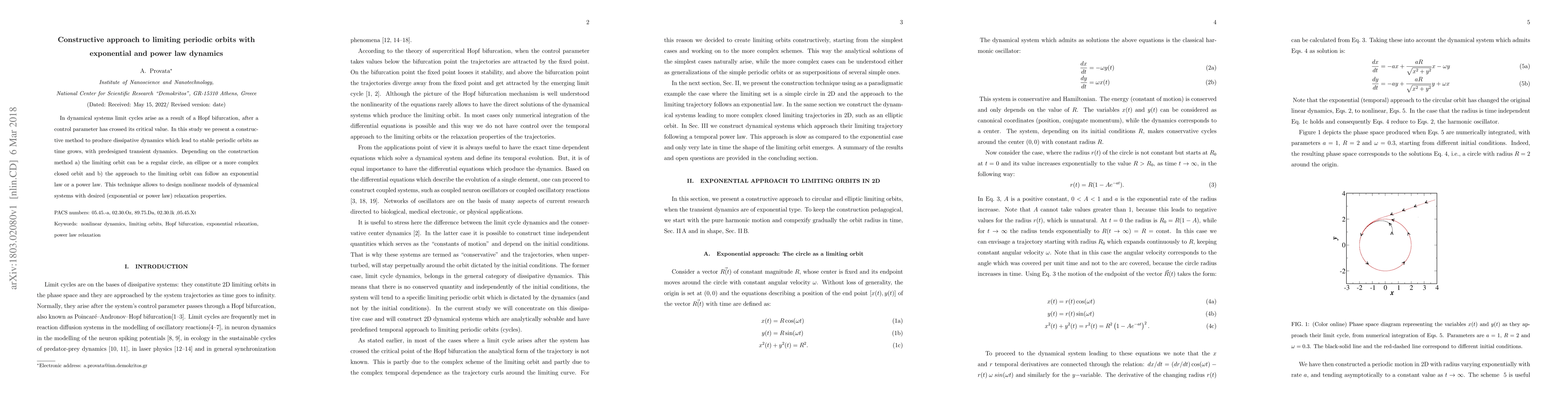 In dynamical systems limit cycles arise as a result of a Hopf bifurcation, after a control parameter has crossed its critical value. In this study we present a constructive method to produce dissipative dynamics which lead to stable periodic orbits as time grows, with predesigned transient dynamics. Depending on the construction method a) the limiting orbit can be a regular circle, an ellipse or a more complex closed orbit and b) the approach to the limiting orbit can follow an exponential law or a power law. This technique allows to design nonlinear models of dynamical systems with desired (exponential or power law) relaxation properties.