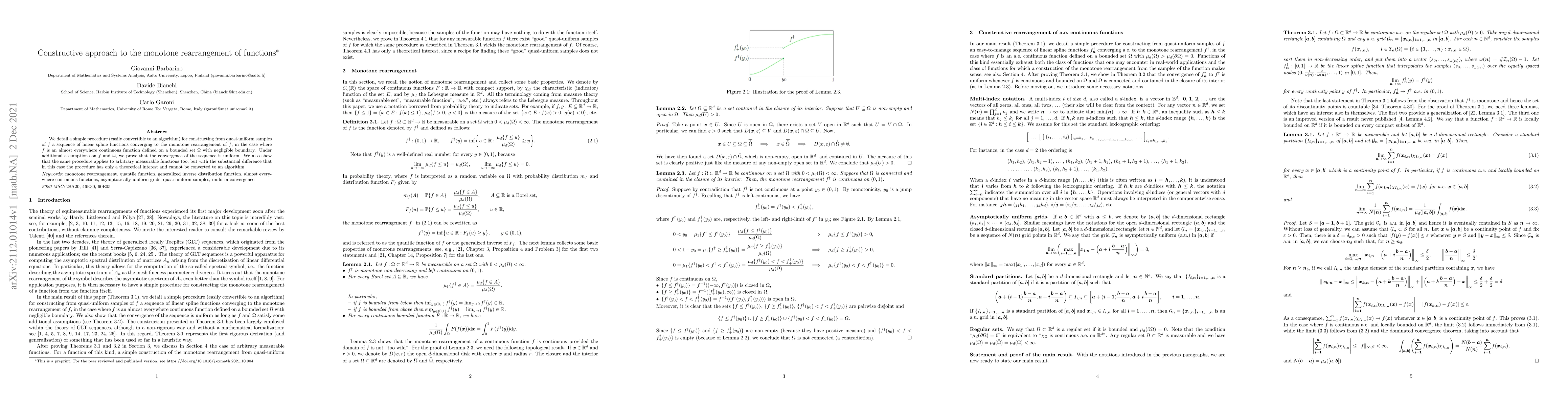 We detail a simple procedure (easily convertible to an algorithm) for constructing from quasi-uniform samples of $f$ a sequence of linear spline functions converging to the monotone rearrangement of $f$, in the case where $f$ is an almost everywhere continuous function defined on a bounded set $\Omega$ with negligible boundary. Under additional assumptions on $f$ and $\Omega$, we prove that the convergence of the sequence is uniform. We also show that the same procedure applies to arbitrary measurable functions too, but with the substantial difference that in this case the procedure has only a theoretical interest and cannot be converted to an algorithm.