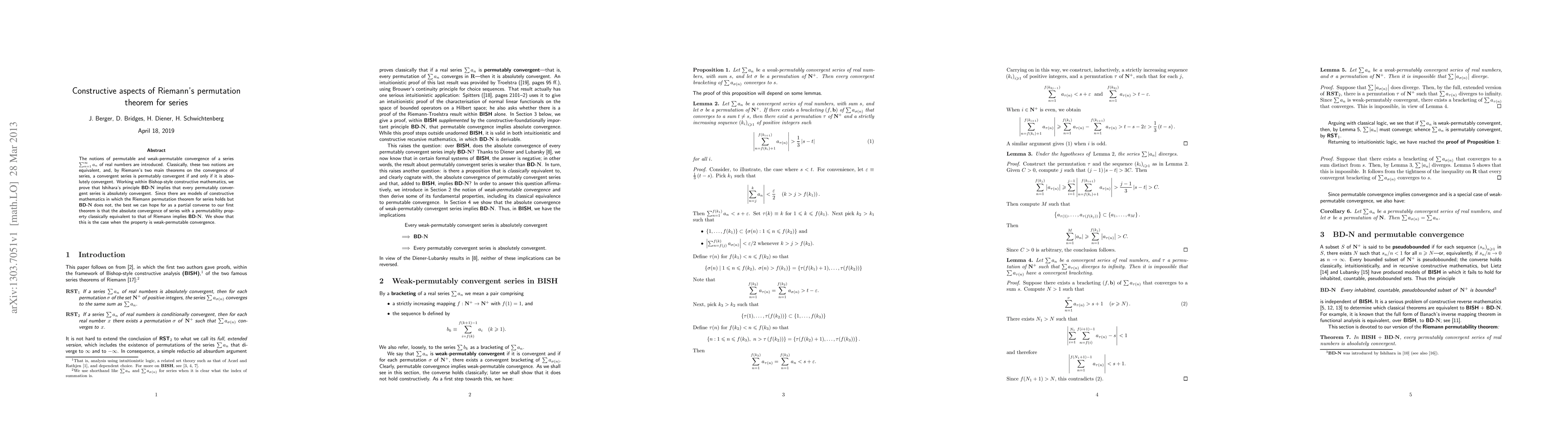 This paper explores the constructive aspects of Riemann's permutation theorem for series, proving that Ishihara's principle \BDN implies absolute convergence for permutably convergent series. It also demonstrates that the absolute convergence of weakly permutable series implies \BDN, providing a partial converse to the constructive proof of Riemann's theorem.