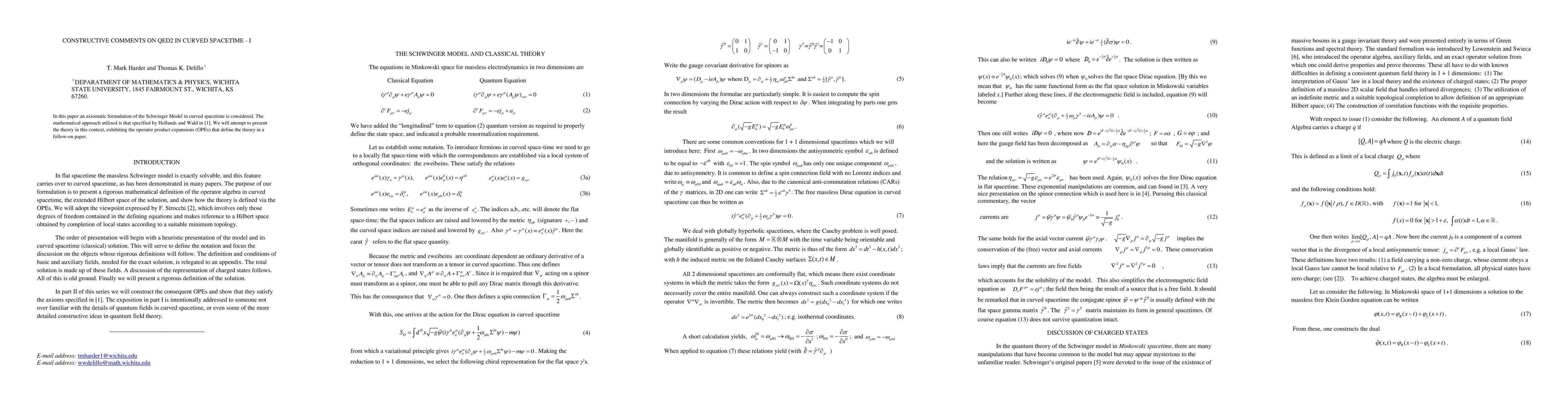 Researchers explore an axiomatic formulation of the Schwinger Model in curved spacetime, using a mathematical approach from Hollands and Wald. They plan to present the theory's key aspects, including operator product expansions, in a follow-up paper.