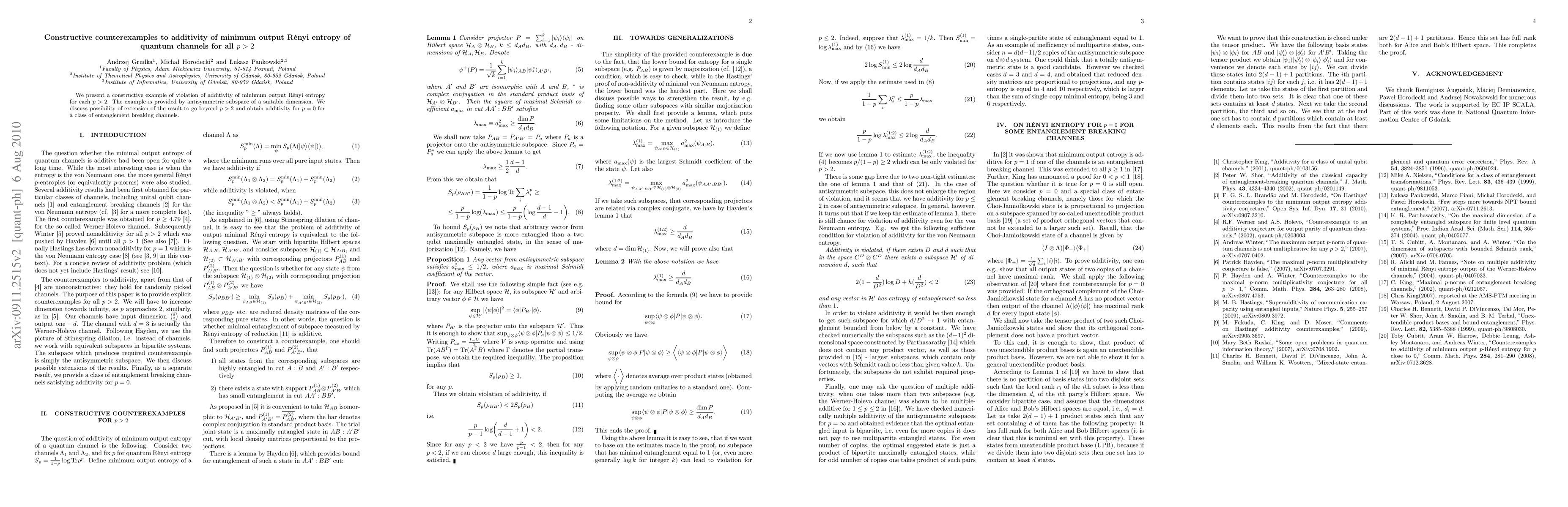 This paper constructs a counterexample demonstrating the non-additivity of minimum output Rényi entropy for quantum channels when p > 2, using antisymmetric subspaces. It also explores extending the result to include p=0 for a subset of entanglement breaking channels.