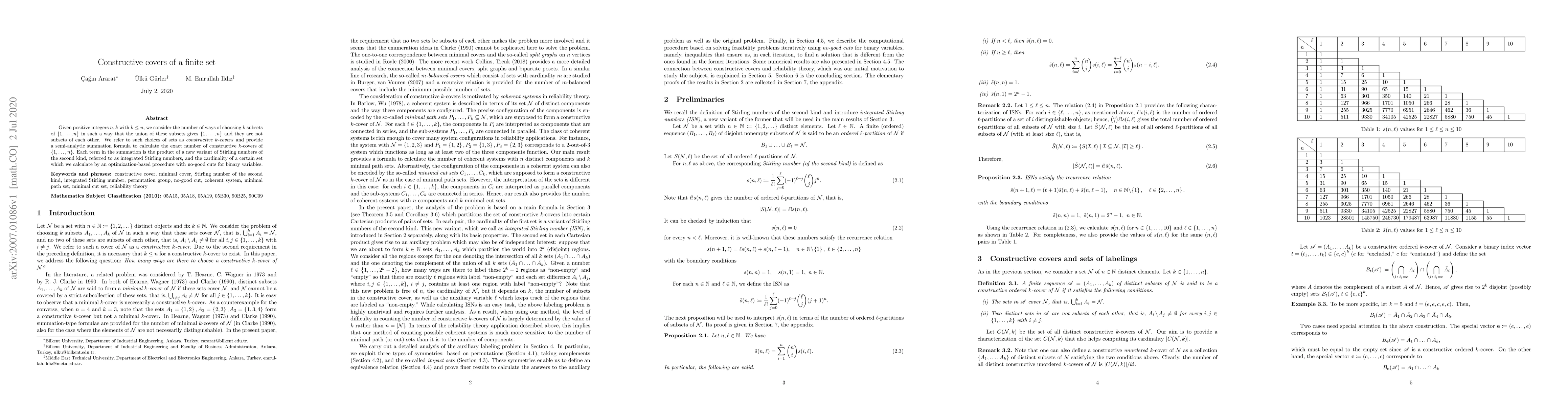 Given positive integers $n,k$ with $k\leq n$, we consider the number of ways of choosing $k$ subsets of $\{1,\ldots,n\}$ in such a way that the union of these subsets gives $\{1,\ldots,n\}$ and they are not subsets of each other. We refer to such choices of sets as constructive $k$-covers and provide a semi-analytic summation formula to calculate the exact number of constructive $k$-covers of $\{1,\ldots,n\}$. Each term in the summation is the product of a new variant of Stirling numbers of the second kind, referred to as integrated Stirling numbers, and the cardinality of a certain set which we calculate by an optimization-based procedure with no-good cuts for binary variables.