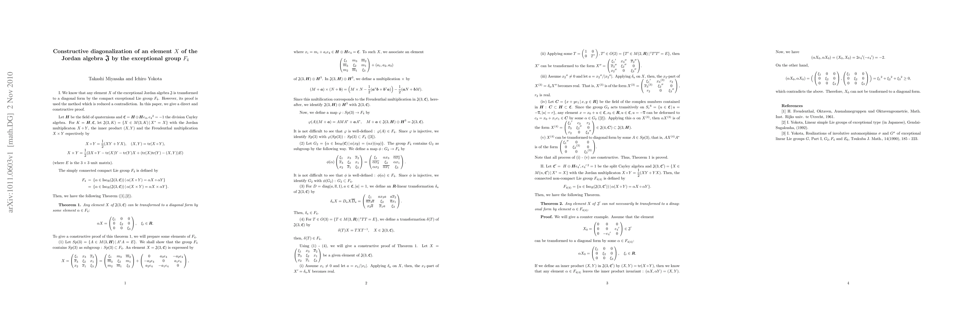 We know that any element $X$ of the exceptional Jordan algebra $\gJ$ is transformed to a diagonal form by the compact exceptional Lie group $F_4$. However, its proof is used the method which is reduced a contradiction. In this paper, we give a direct and constructive proof.