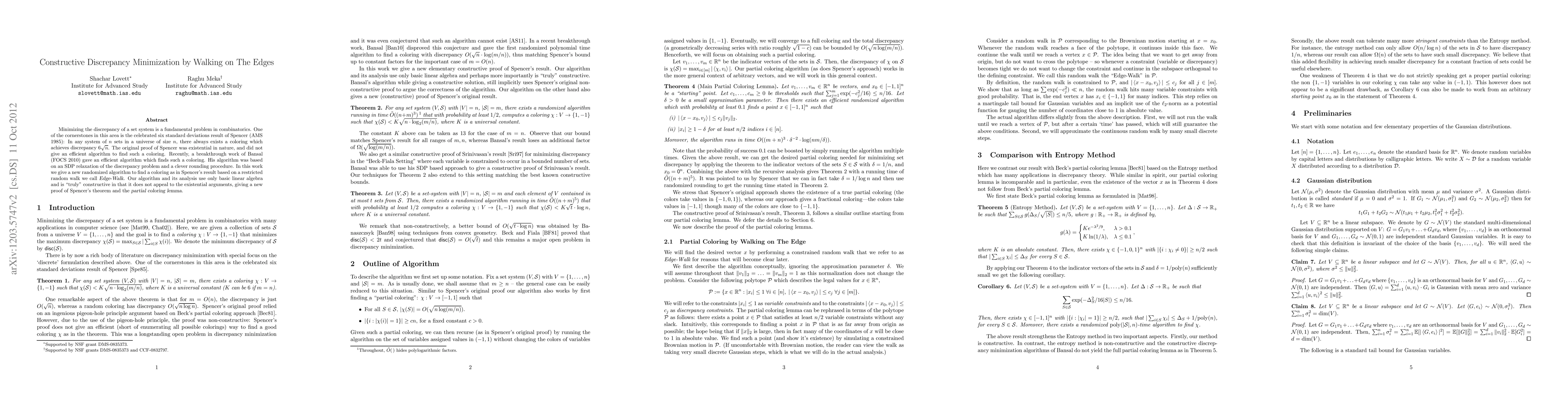 This paper presents a new randomized algorithm called "Edge-Walk" for constructive discrepancy minimization, providing a direct method to find a coloring achieving Spencer's 6√n discrepancy bound without relying on existential arguments or SDP relaxations. The algorithm uses basic linear algebra and offers a novel constructive proof of Spencer's theorem.