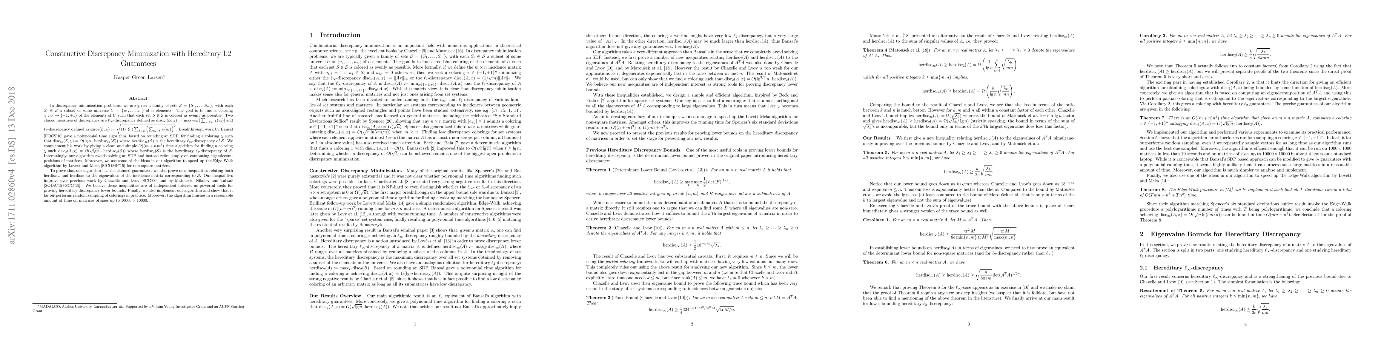 This paper presents a polynomial time algorithm for constructive discrepancy minimization that achieves hereditary L2 guarantees without solving an SDP. It introduces an alternative method based on matrix eigendecompositions, improving upon previous inequalities and outperforming random sampling in practical implementations.