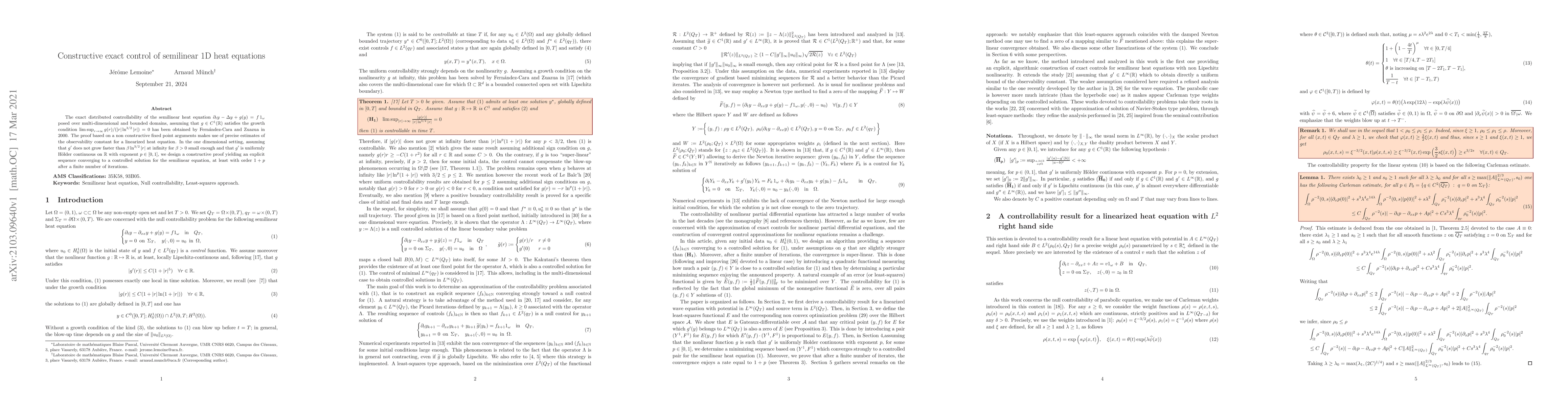 The exact distributed controllability of the semilinear heat equation $\partial_{t}y-\Delta y + g(y)=f \,1_{\omega}$ posed over multi-dimensional and bounded domains, assuming that $g\in C^1(\mathbb{R})$ satisfies the growth condition $\limsup_{r\to \infty} g(r)/(\vert r\vert \ln^{3/2}\vert r\vert)=0$ has been obtained by Fern\'andez-Cara and Zuazua in 2000. The proof based on a non constructive fixed point arguments makes use of precise estimates of the observability constant for a linearized heat equation. In the one dimensional setting, assuming that $g^\prime$ does not grow faster than $\beta \ln^{3/2}\vert r\vert$ at infinity for $\beta>0$ small enough and that $g^\prime$ is uniformly H\"older continuous on $\mathbb{R}$ with exponent $p\in [0,1]$, we design a constructive proof yielding an explicit sequence converging to a controlled solution for the semilinear equation, at least with order $1+p$ after a finite number of iterations.