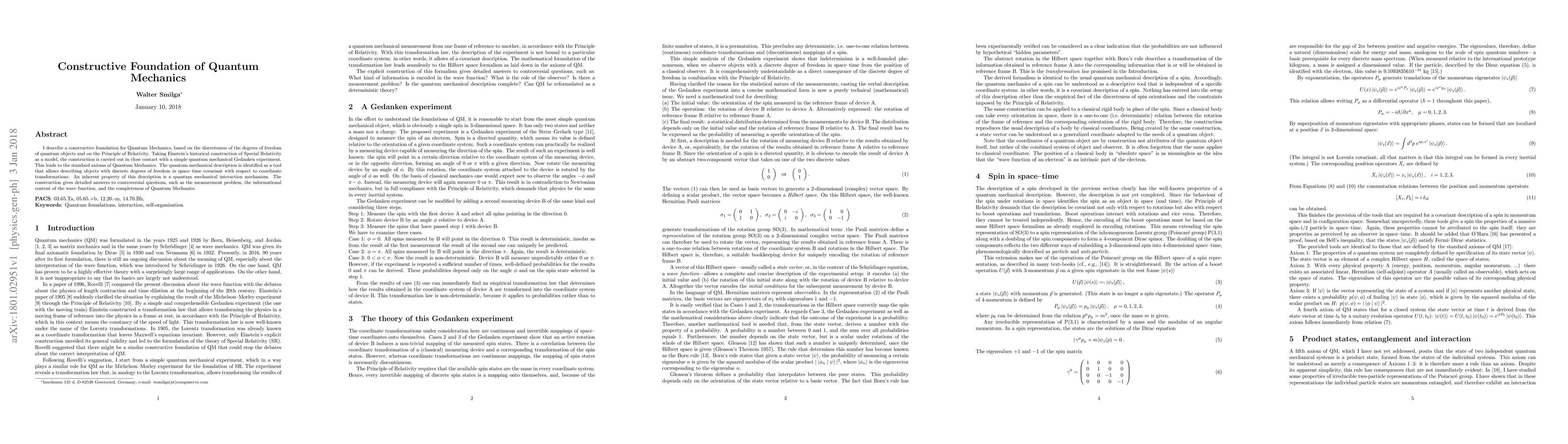 I describe a constructive foundation for Quantum Mechanics, based on the discreteness of the degrees of freedom of quantum objects and on the Principle of Relativity. Taking Einstein's historical construction of Special Relativity as a model, the construction is carried out in close contact with a simple quantum mechanical Gedanken experiment. This leads to the standard axioms of Quantum Mechanics. The quantum mechanical description is identified as a tool that allows describing objects with discrete degrees of freedom in space-time covariant with respect to coordinate transformations. An inherent property of this description is a quantum mechanical interaction mechanism. The construction gives detailed answers to controversial questions, such as the measurement problem, the informational content of the wave function, and the completeness of Quantum Mechanics.
