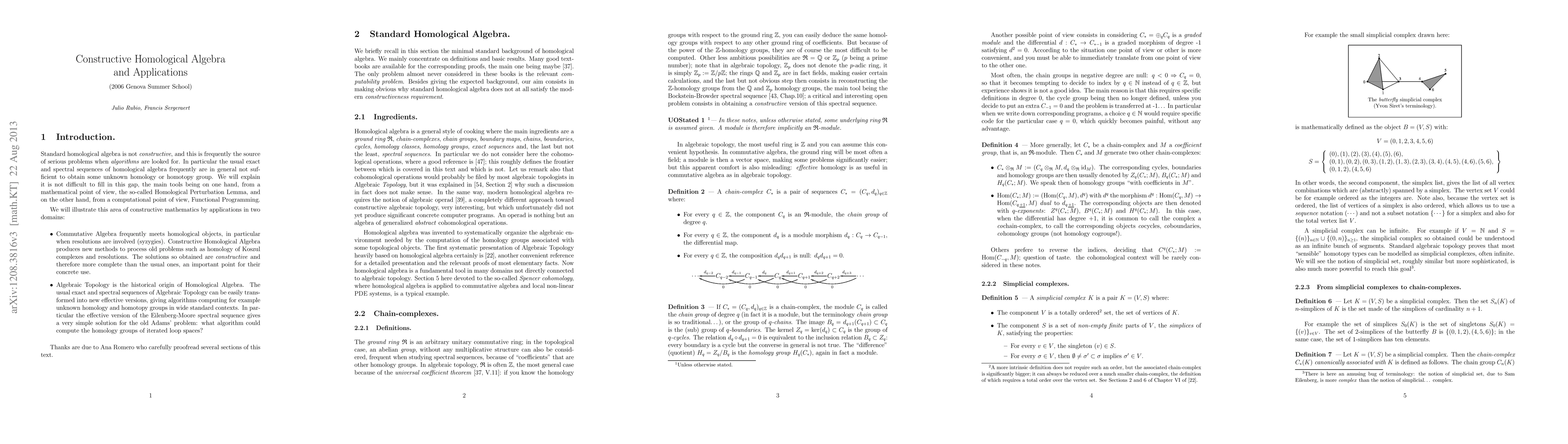 The paper provides a detailed exposition on constructive Homological Algebra, focusing on the Basic Perturbation Lemma to make Homological Algebra constructive where standard Homological Algebra is not. It applies this technology in Commutative Algebra (Koszul complexes) and Algebraic Topology (effective versions of spectral sequences).