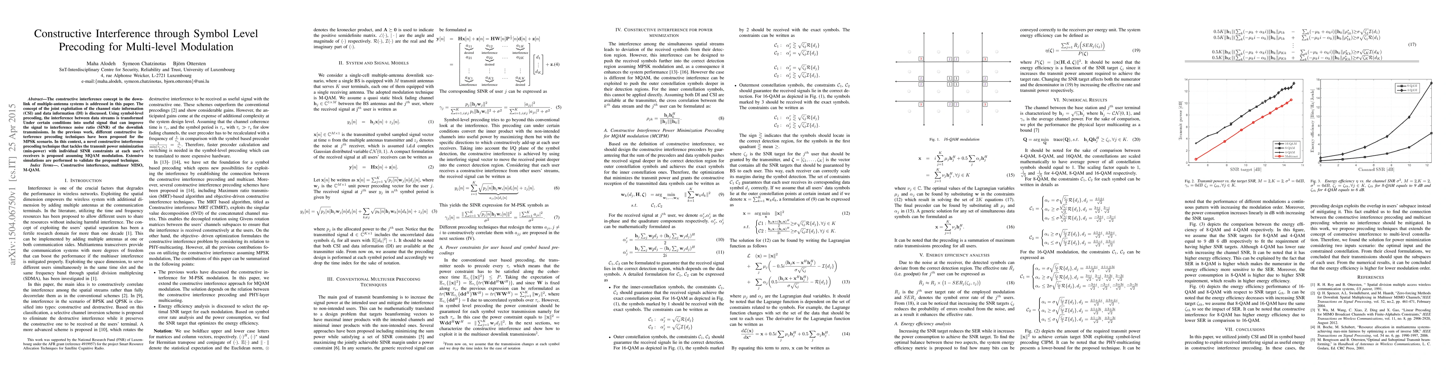 This paper proposes a novel constructive interference precoding technique for multi-level modulation in multiple-antenna systems, leveraging symbol-level precoding to transform interference into useful signals. The method aims to minimize transmit power while maintaining individual SINR constraints, validated through extensive simulations.