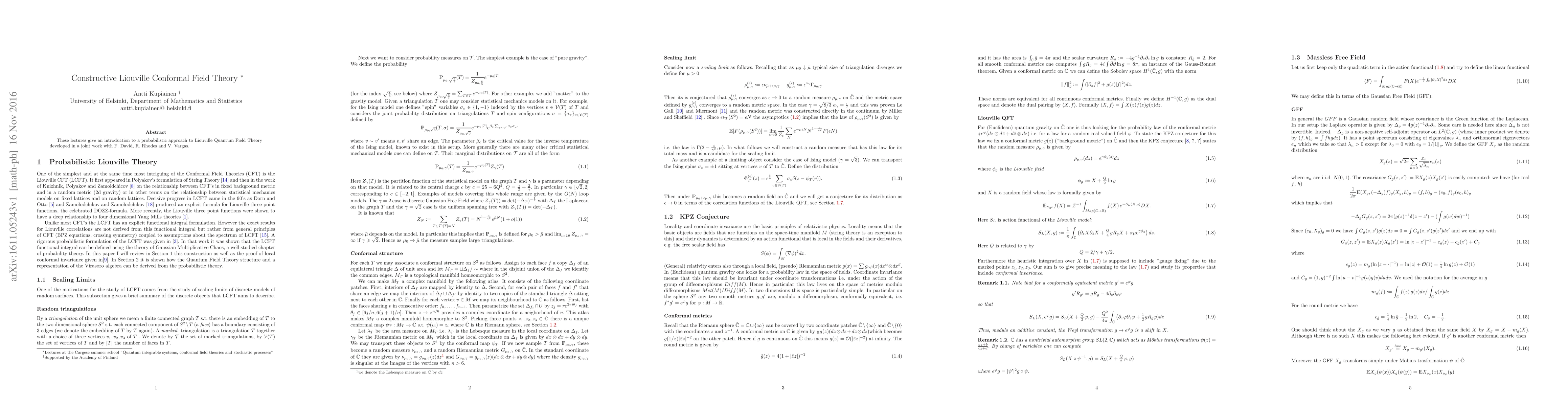 Summary: This paper introduces a probabilistic framework for Liouville Quantum Field Theory, developed collaboratively with F. David, R. Rhodes, and V. Vargas, offering a novel approach to understanding the theory's constructs. The probabilistic method provides new insights into the field's complex structures.