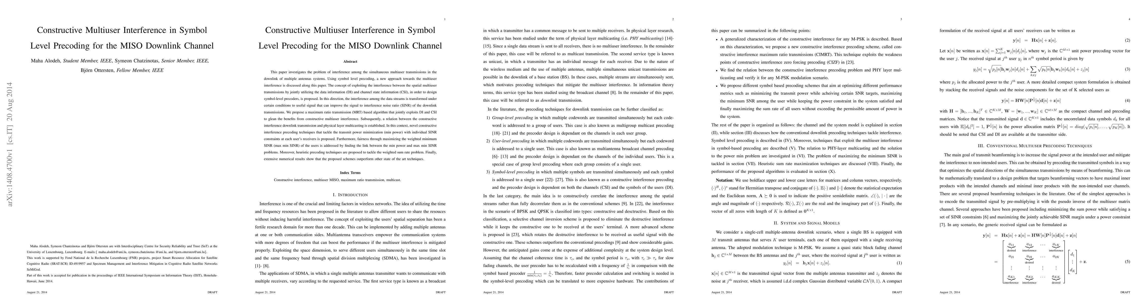 This paper proposes a novel symbol-level precoding approach to constructively manage interference in multiuser MISO downlink channels, leveraging data and channel information to transform interference into a beneficial signal. The proposed maximum ratio transmission algorithm and constructive interference precoding techniques aim to minimize transmit power while maximizing the weighted minimum signal-to-interference-plus-noise ratio (SINR), outperforming existing methods as shown by numerical results.