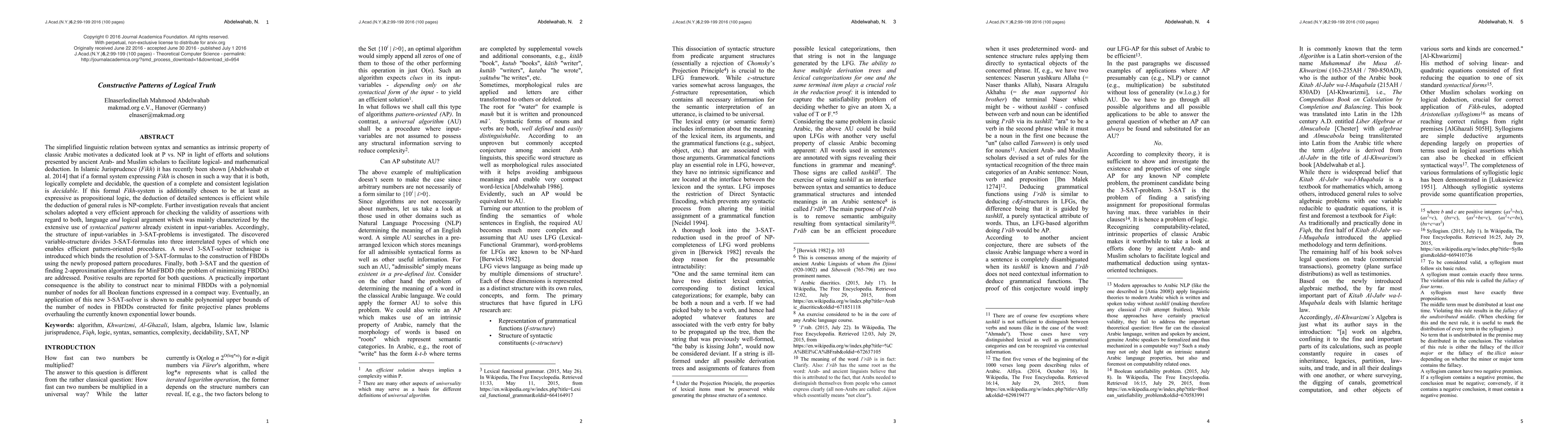 The simplified linguistic relation between syntax and semantics as intrinsic property of classic Arabic motivates a dedicated look at P vs. NP in light of efforts and solutions presented by ancient Arab- and Muslim scholars to facilitate logical- and mathematical deduction. In Islamic Jurisprudence (Fikh) it has recently been shown [Abdelwahab et al. 2014] that if a formal system expressing Fikh is chosen in such a way that it is both, logically complete and decidable, the question of a complete and consistent legislation is decidable. If this formal Fikh-system is additionally chosen to be at least as expressive as propositional logic, the deduction of detailed sentences is efficient while the deduction of general rules is NP-complete. Further investigation reveals that ancient scholars adopted a very efficient approach for checking the validity of assertions with regard to both, language and logical argument which was mainly characterized by the extensive use of syntactical patterns already existent in input-variables. Accordingly, this paper introduces efficient pattern-oriented procedures for 3-SAT as well as 2-approximation algorithms for MinFBDD. It opens up the possibility of constructing polynomial sized FBDDs for all Boolean functions expressed in a compact way. Eventually, an application of this new 3-SAT-solver is shown to enable polynomial upper bounds of the number of nodes in FBDDs constructed for finite projective planes problems overhauling the currently known exponential lower bounds.