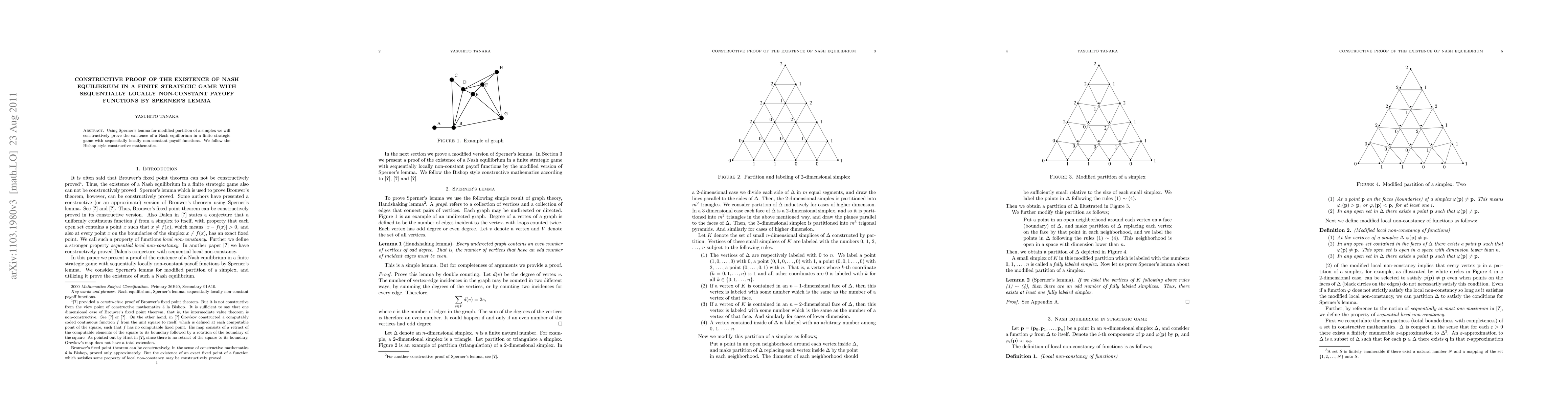 Using Sperner's lemma for modified partition of a simplex we will constructively prove the existence of a Nash equilibrium in a finite strategic game with sequentially locally non-constant payoff functions. We follow the Bishop style constructive mathematics.