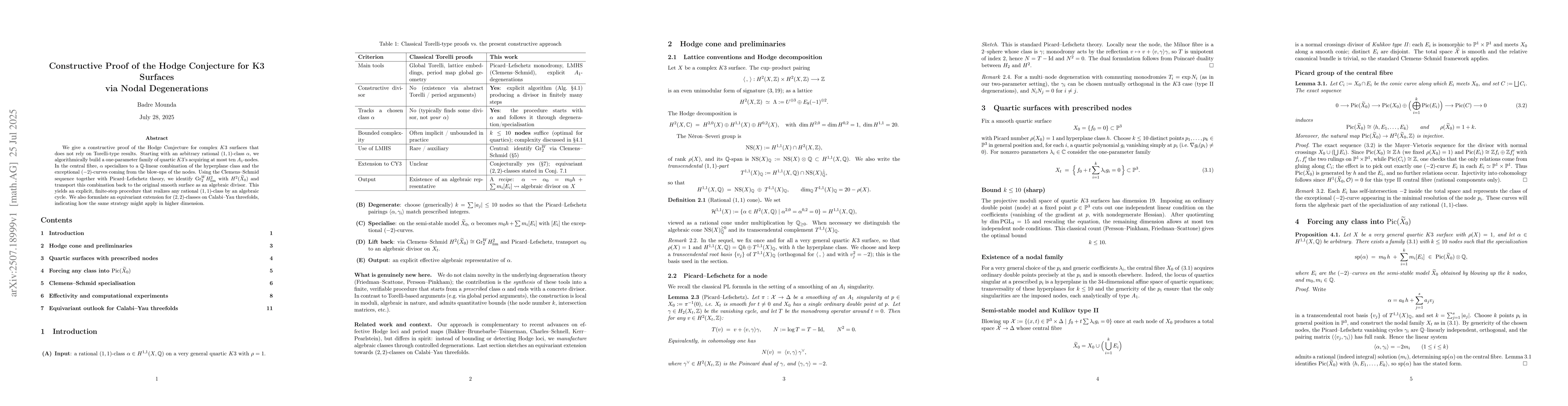 We give a constructive proof of the Hodge conjecture for complex $K3$ surfaces that does not rely on Torelli-type results. Starting with an arbitrary rational $(1,1)$-class $\alpha\in H^{1,1}(X,\mathbb{Q})$, we algorithmically build a one-parameter family of quartic $K3$'s acquiring at most ten $A_1$-nodes. On the central fibre $\widetilde{X}_0$, the class $\alpha$ specializes to a $\mathbb{Q}$-linear combination of the hyperplane class and the exceptional $(-2)$-curves coming from the blow-ups of the nodes. Using the Clemens--Schmid sequence together with Picard--Lefschetz theory, we identify $\Gr^W_2 H^2_{\lim}\cong H^2(\widetilde{X}_0)$ and transport this combination back to the original smooth surface as an algebraic divisor. This yields an explicit, finite-step procedure that realizes any rational $(1,1)$-class by an algebraic cycle. We also formulate an equivariant extension for $(2,2)$-classes on Calabi--Yau threefolds, indicating how the same strategy might apply in higher dimension.