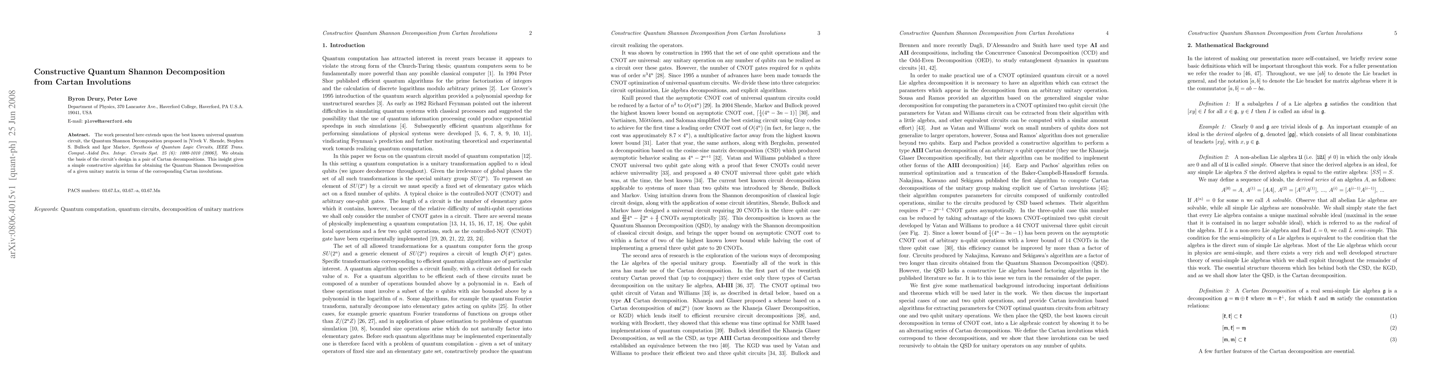 The work presented here extends upon the best known universal quantum circuit, the Quantum Shannon Decomposition proposed in [Vivek V. Shende, Stephen S. Bullock and Igor Markov, Synthesis of Quantum Logic Circuits, IEEE Trans. Comput.-Aided Des. Integr. Circuits Syst. 25 (6): 1000-1010 (2006)]. We obtain the basis of the circuit's design in a pair of Cartan decompositions. This insight gives a simple constructive algorithm for obtaining the Quantum Shannon Decomposition of a given unitary matrix in terms of the corresponding Cartan involutions.