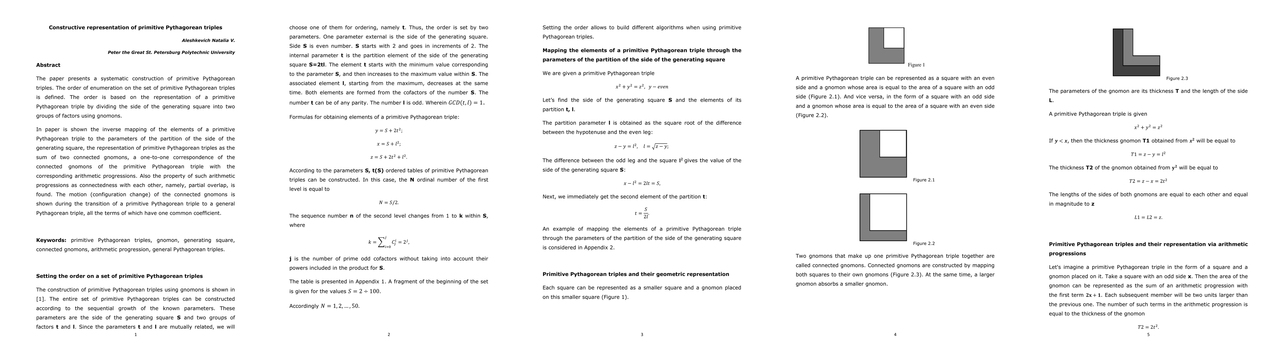 The paper presents a systematic construction of primitive Pythagorean triples. The order of enumeration on the set of primitive Pythagorean triples is defined. The order is based on the representation of a primitive Pythagorean triple by dividing the side of the generating square into two groups of factors using gnomons. In paper is shown the inverse mapping of the elements of a primitive Pythagorean triple to the parameters of the partition of the side of the generating square, the representation of primitive Pythagorean triples as the sum of two connected gnomons, a one-to-one correspondence of the connected gnomons of the primitive Pythagorean triple with the corresponding arithmetic progressions. Also the property of such arithmetic progressions as connectedness with each other, namely, partial overlap, is found. The motion (configuration change) of the connected gnomons is shown during the transition of a primitive Pythagorean triple to a general Pythagorean triple, all the terms of which have one common coefficient.