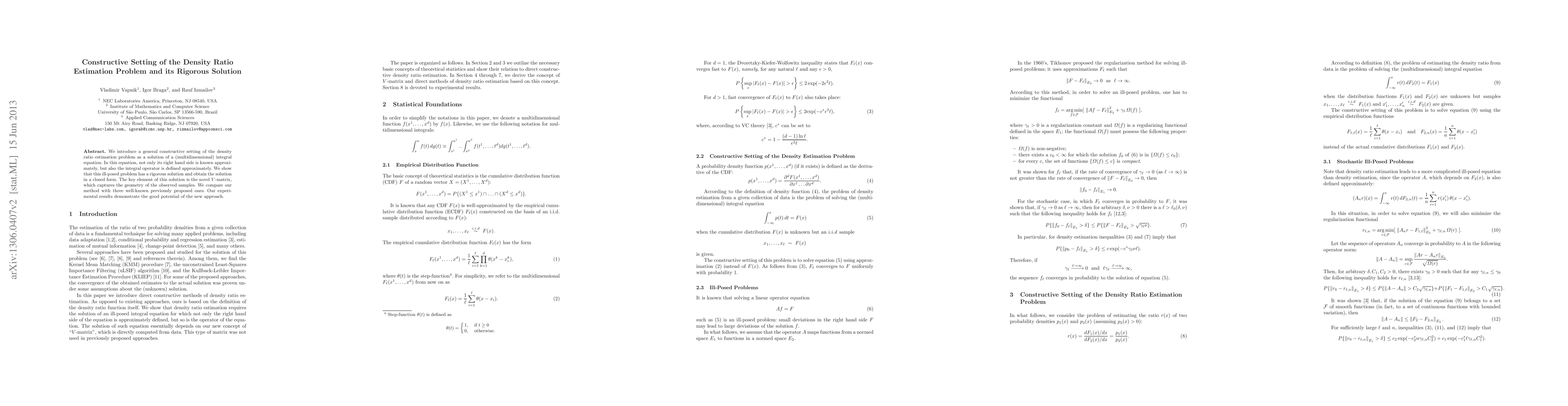 We introduce a general constructive setting of the density ratio estimation problem as a solution of a (multidimensional) integral equation. In this equation, not only its right hand side is known approximately, but also the integral operator is defined approximately. We show that this ill-posed problem has a rigorous solution and obtain the solution in a closed form. The key element of this solution is the novel V-matrix, which captures the geometry of the observed samples. We compare our method with three well-known previously proposed ones. Our experimental results demonstrate the good potential of the new approach.