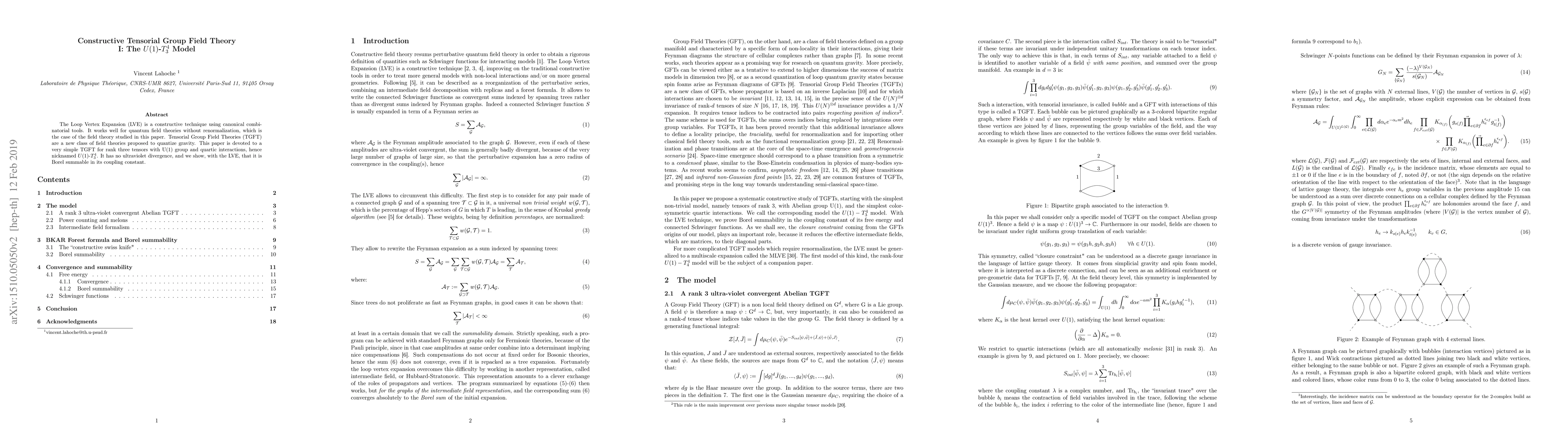 The Loop Vertex Expansion (LVE) is a constructive technique using canonical combinatorial tools. It works well for quantum field theories without renormalization, which is the case of the field theory studied in this paper. Tensorial Group Field Theories (TGFT) are a new class of field theories proposed to quantize gravity. This paper is devoted to a very simple TGFT for rank three tensors with U(1)group and quartic interactions, hence nicknamed $U(1)$-$T^4_3$. It has no ultraviolet divergence, and we show, with the LVE, that it is Borel summable in its coupling constant.
