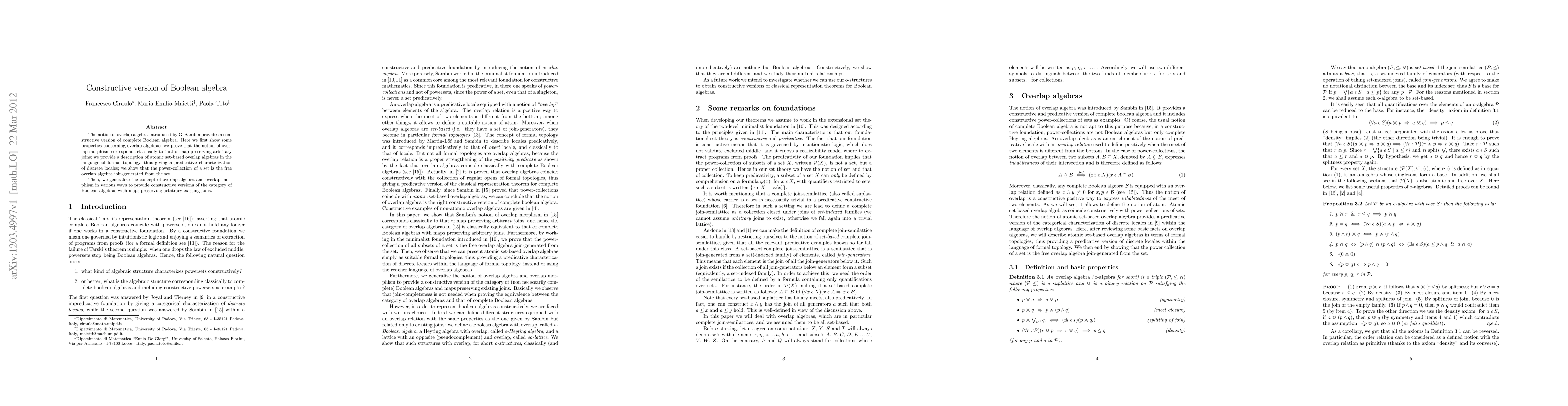 The paper explores a constructive version of Boolean algebra through overlap algebras, proving properties of overlap morphisms and providing a predicative characterization of discrete locales, ultimately generalizing the concept to cover the category of Boolean algebras with maps preserving joins.