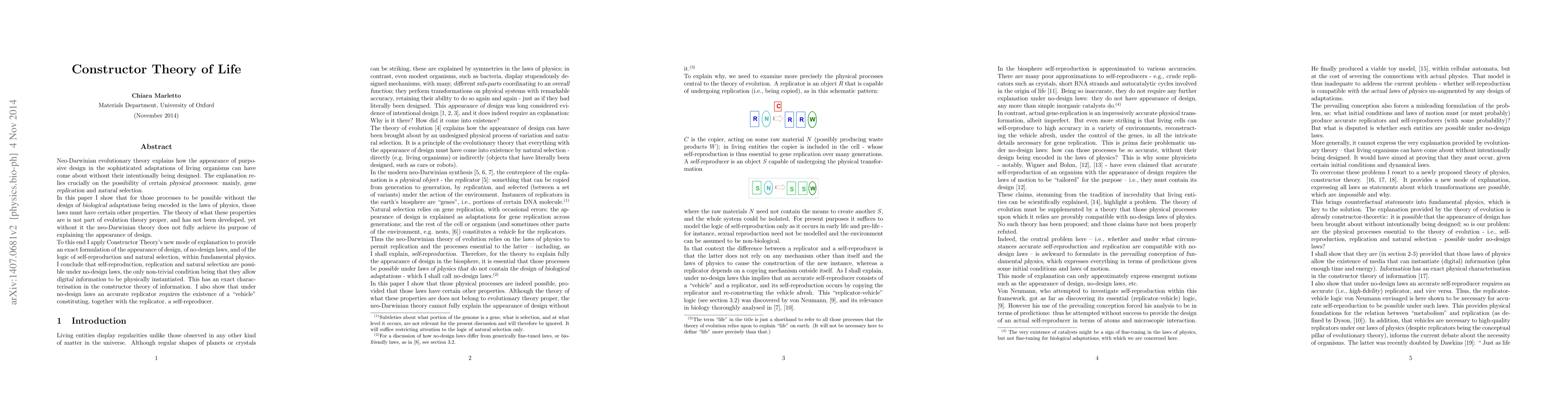 Neo-Darwinian evolutionary theory explains how the appearance of purposive design in the sophisticated adaptations of living organisms can have come about without their intentionally being designed. The explanation relies crucially on the possibility of certain physical processes: mainly, gene replication and natural selection. In this paper I show that for those processes to be possible without the design of biological adaptations being encoded in the laws of physics, those laws must have certain other properties. The theory of what these properties are is not part of evolution theory proper, and has not been developed, yet without it the neo-Darwinian theory does not fully achieve its purpose of explaining the appearance of design. To this end I apply Constructor Theory's new mode of explanation to provide an exact formulation of the appearance of design, of no-design laws, and of the logic of self-reproduction and natural selection, within fundamental physics. I conclude that self-reproduction, replication and natural selection are possible under no-design laws, the only non-trivial condition being that they allow digital information to be physically instantiated. This has an exact characterisation in the constructor theory of information. I also show that under no-design laws an accurate replicator requires the existence of a "vehicle" constituting, together with the replicator, a self-reproducer.