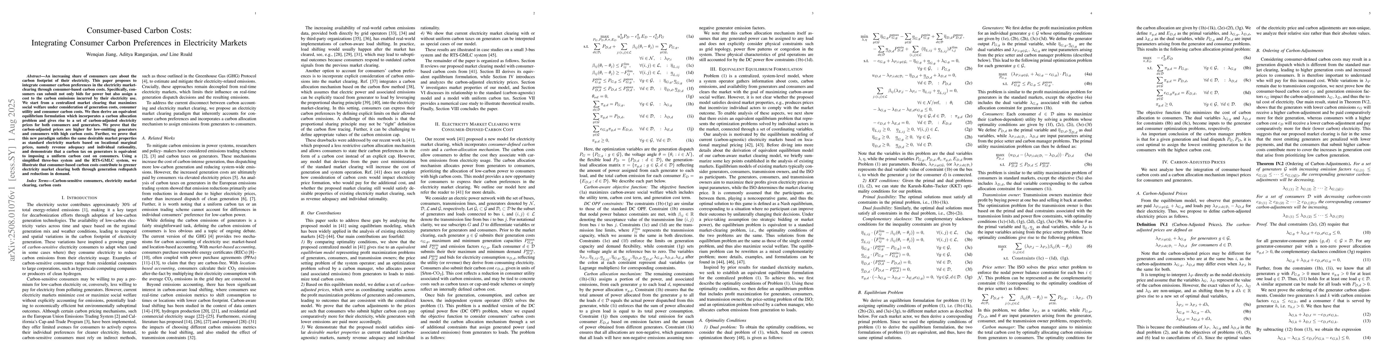 An increasing share of consumers care about the carbon footprint of their electricity. This paper proposes to integrate consumer carbon preferences in the electricity market-clearing through consumer-based carbon costs. Specifically, consumers can submit not only bids for power but also assign a cost to the carbon emissions incurred by their electricity use. We start from a centralized market clearing that maximizes social welfare under consideration of generation costs, consumer utility and consumer carbon costs. We then derive an equivalent equilibrium formulation which incorporates a carbon allocation problem and gives rise to a set of carbon-adjusted electricity prices for both consumers and generators. We prove that the carbon-adjusted prices are higher for low-emitting generators and consumers with high carbon costs. Further, we prove that this new paradigm satisfies the same desirable market properties as standard electricity markets based on locational marginal prices, namely revenue adequacy and individual rationality, and demonstrate that a carbon tax on generators is equivalent to imposing a uniform carbon cost on consumers. Using a simplified three-bus system and the RTS-GMLC system, we illustrate that consumer-based carbon costs contribute to greener electricity market clearing both through generation redispatch and reductions in demand.