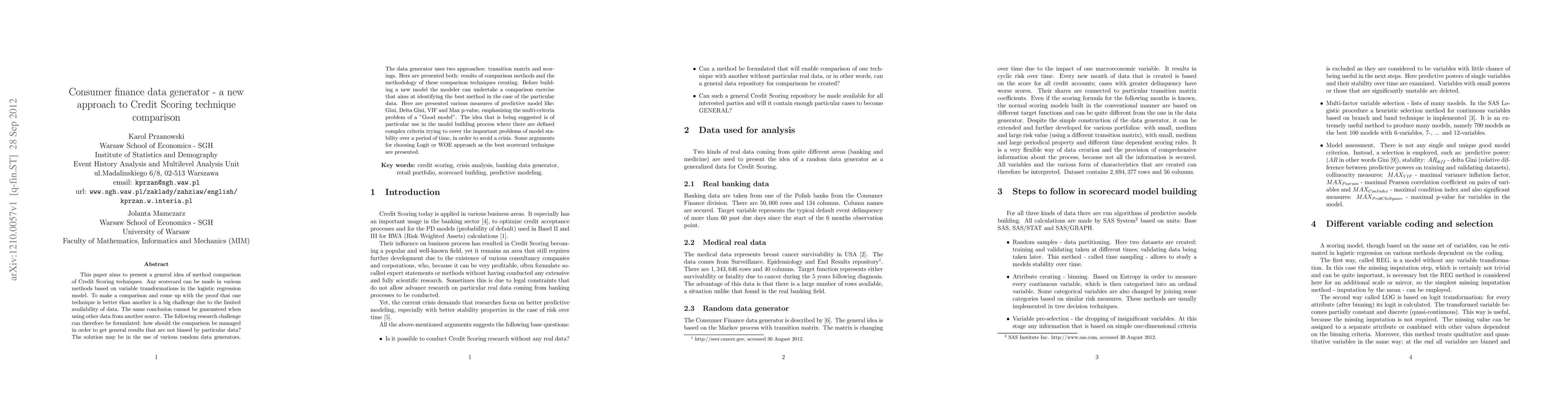 This paper compares various Credit Scoring techniques using logistic regression models and explores how to manage comparisons to avoid data-specific biases. It proposes using random data generators and evaluates multiple predictive measures to identify the best method for model building, emphasizing the importance of model stability and the potential benefits of Logit or WOE approaches.