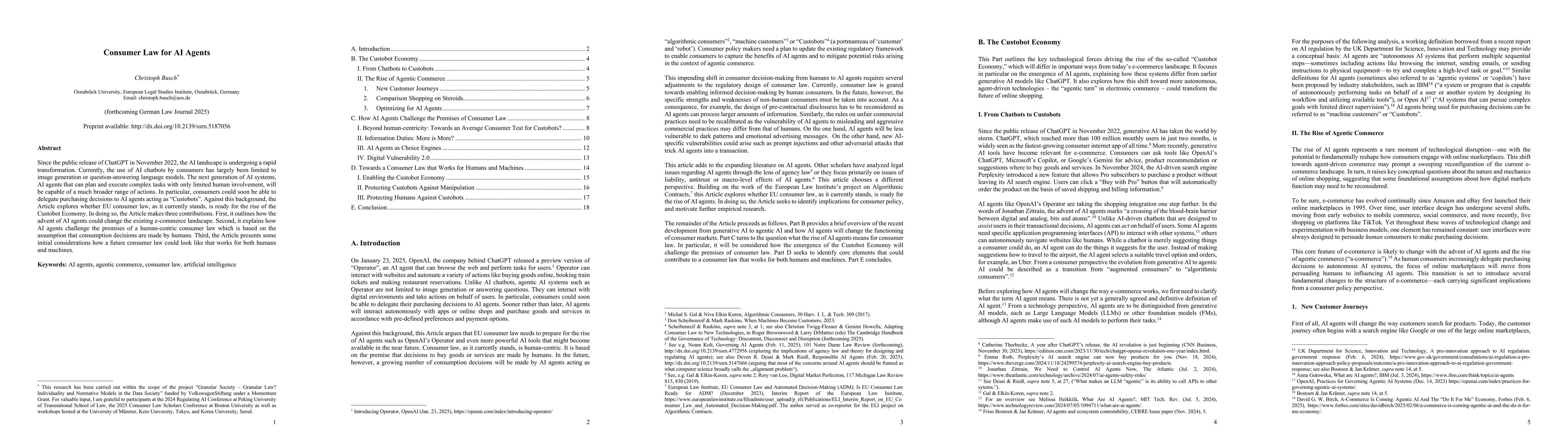The paper analyzes the impact of AI agents on consumer law through examining changes in e-commerce, challenging human-centric consumer law premises, and proposing considerations for future consumer law adaptations.