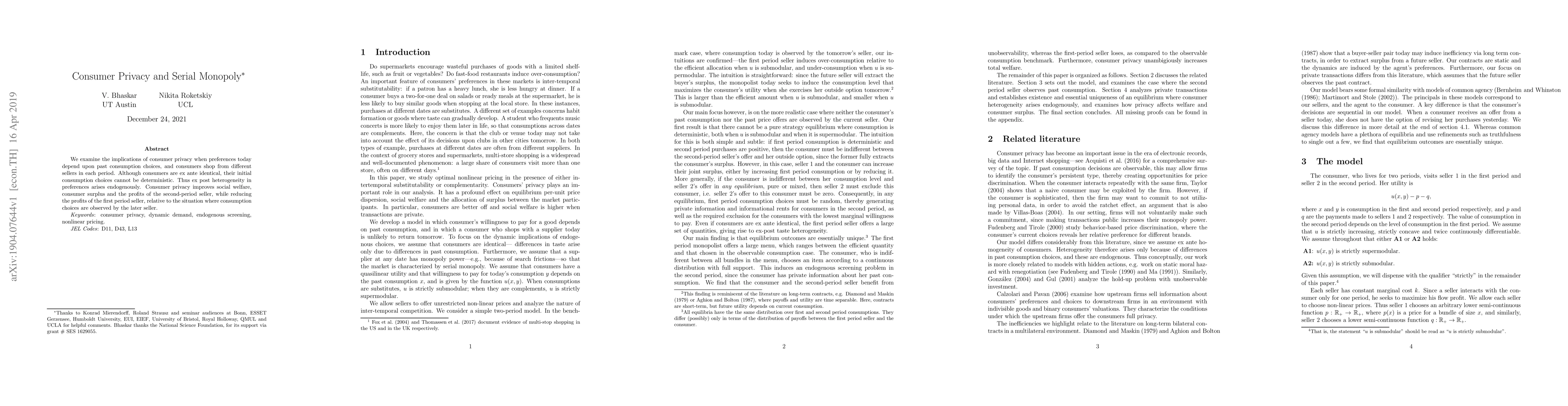 We examine the implications of consumer privacy when preferences today depend upon past consumption choices, and consumers shop from different sellers in each period. Although consumers are ex ante identical, their initial consumption choices cannot be deterministic. Thus ex post heterogeneity in preferences arises endogenously. Consumer privacy improves social welfare, consumer surplus and the profits of the second-period seller, while reducing the profits of the first period seller, relative to the situation where consumption choices are observed by the later seller.