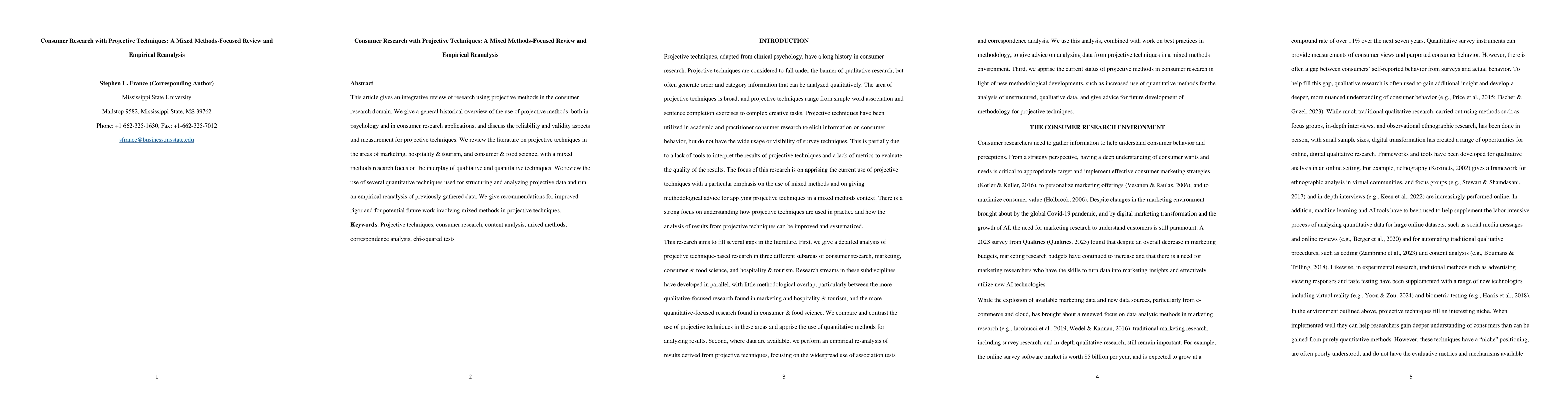 This article provides a comprehensive review of projective methods in consumer research, highlighting their historical application, reliability, and validity. It combines qualitative and quantitative techniques in mixed methods research and includes an empirical reanalysis to recommend enhanced rigor and future directions.