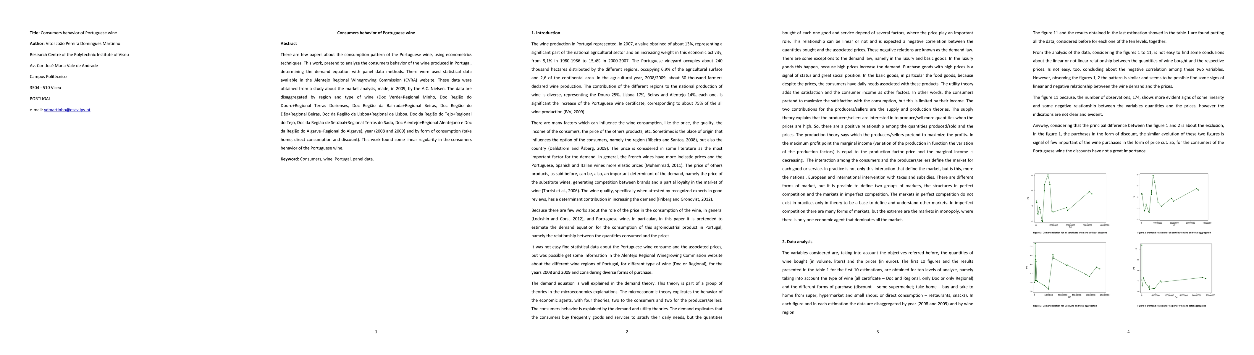 There are few papers about the consumption pattern of the Portuguese wine, using econometrics techniques. This work, pretend to analyze the consumers behavior of the wine produced in Portugal, determining the demand equation with panel data methods. There were used statistical data available in the Alentejo Regional Winegrowing Commission (CVRA) website. These data were obtained from a study about the market analysis, made, in 2009, by the A.C. Nielsen. The data are disaggregated by region and type of wine (Doc Verde+Regional Minho, Doc Regiao do Douro+Regional Terras Durienses, Doc Regiao da Bairrada+Regional Beiras, Doc Regiao do Dao+Regional Beiras, Doc da Regiao de Lisboa+Regional de Lisboa, Doc da Regiao do Tejo+Regional do Tejo, Doc da Regiao de Setubal+Regional Terras do Sado, Doc Alentejo+Regional Alentejano e Doc da Regiao do Algarve+Regional do Algarve), year (2008 and 2009) and by form of consumption (take home, direct consumption and discount). This work found some linear regularity in the consumers behavior of the Portuguese wine.