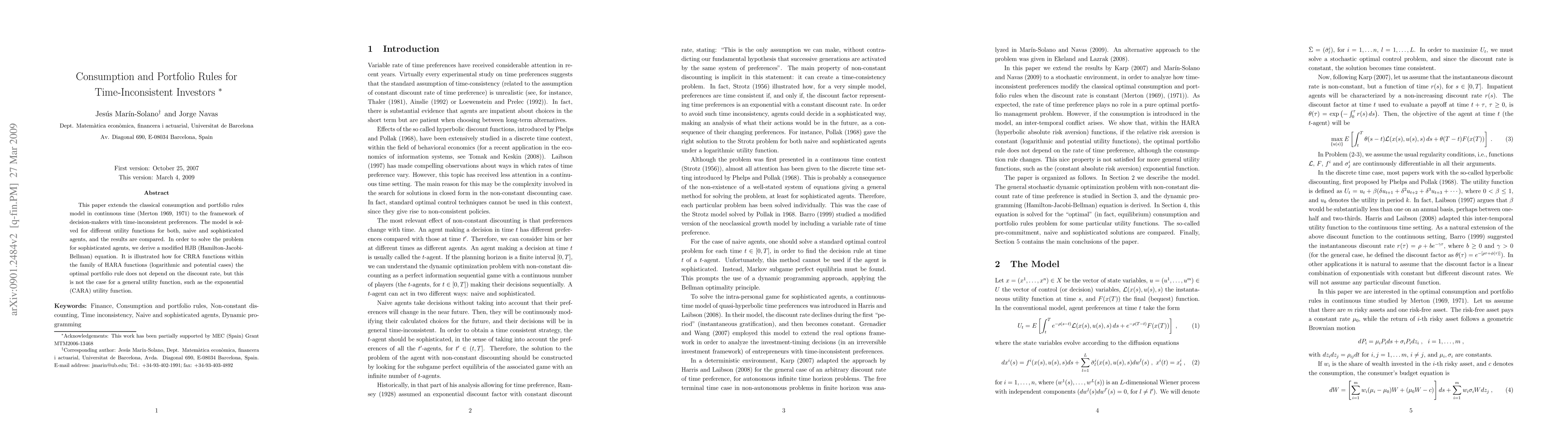 This paper extends the classical consumption and portfolio rules model in continuous time (Merton 1969, 1971) to the framework of decision-makers with time-inconsistent preferences. The model is solved for different utility functions for both, naive and sophisticated agents, and the results are compared. In order to solve the problem for sophisticated agents, we derive a modified HJB (Hamilton-Jacobi-Bellman) equation. It is illustrated how for CRRA functions within the family of HARA functions (logarithmic and potential cases) the optimal portfolio rule does not depend on the discount rate, but this is not the case for a general utility function, such as the exponential (CARA) utility function.