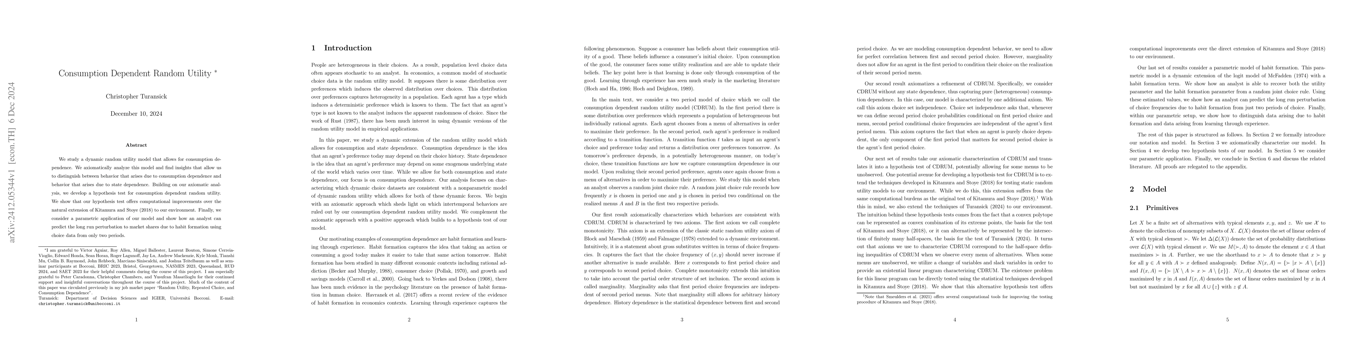 We study a dynamic random utility model that allows for consumption dependence. We axiomatically analyze this model and find insights that allow us to distinguish between behavior that arises due to consumption dependence and behavior that arises due to state dependence. Building on our axiomatic analysis, we develop a hypothesis test for consumption dependent random utility. We show that our hypothesis test offers computational improvements over the natural extension of Kitamura and Stoye (2018) to our environment. Finally, we consider a parametric application of our model and show how an analyst can predict the long run perturbation to market shares due to habit formation using choice data from only two periods.
