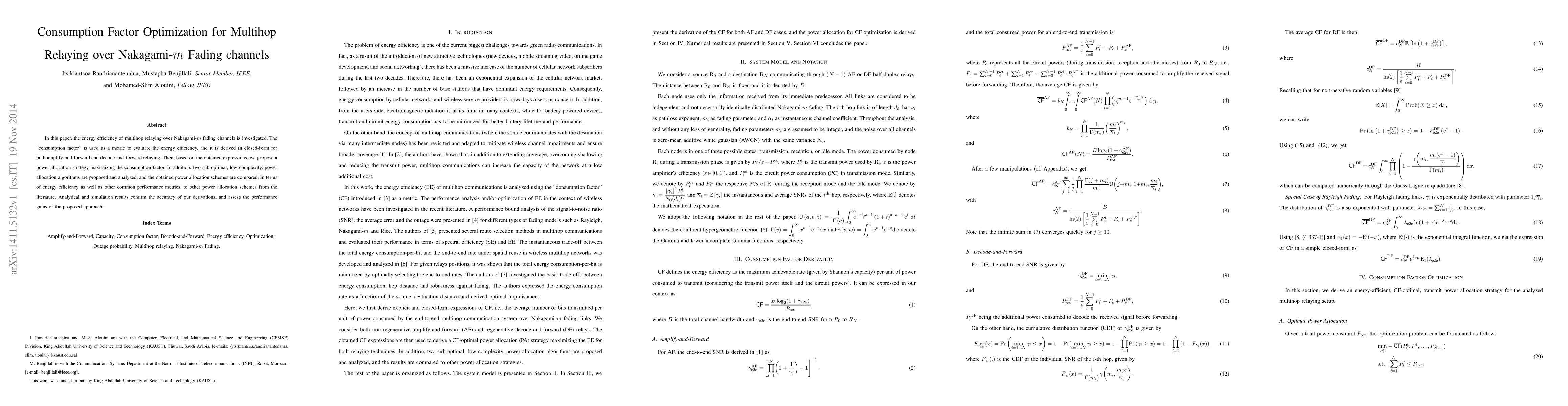 This paper investigates energy efficiency in multihop relaying over Nakagami-$m$ fading channels, optimizing the "consumption factor" metric. It proposes a power allocation strategy to maximize this factor, alongside two sub-optimal algorithms, and compares their performance against existing schemes, demonstrating improved energy efficiency through analytical and simulation results.