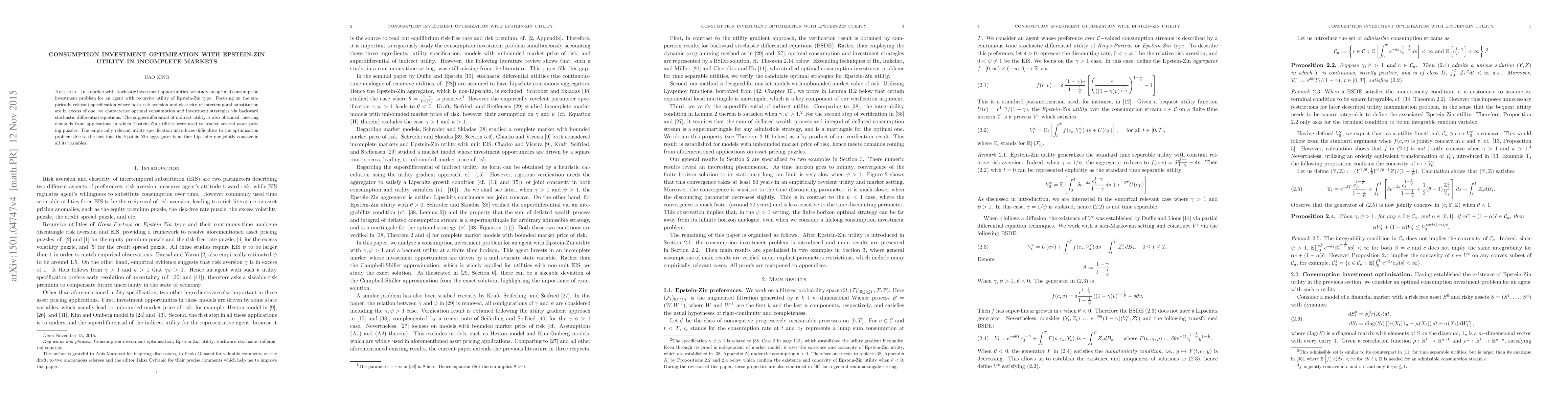 This paper studies optimal consumption and investment strategies for an agent with Epstein-Zin utility in a stochastic market, focusing on the case where both risk aversion and intertemporal substitution exceed one. It characterizes these strategies using backward stochastic differential equations and addresses the complexities arising from the non-standard properties of the Epstein-Zin utility function.