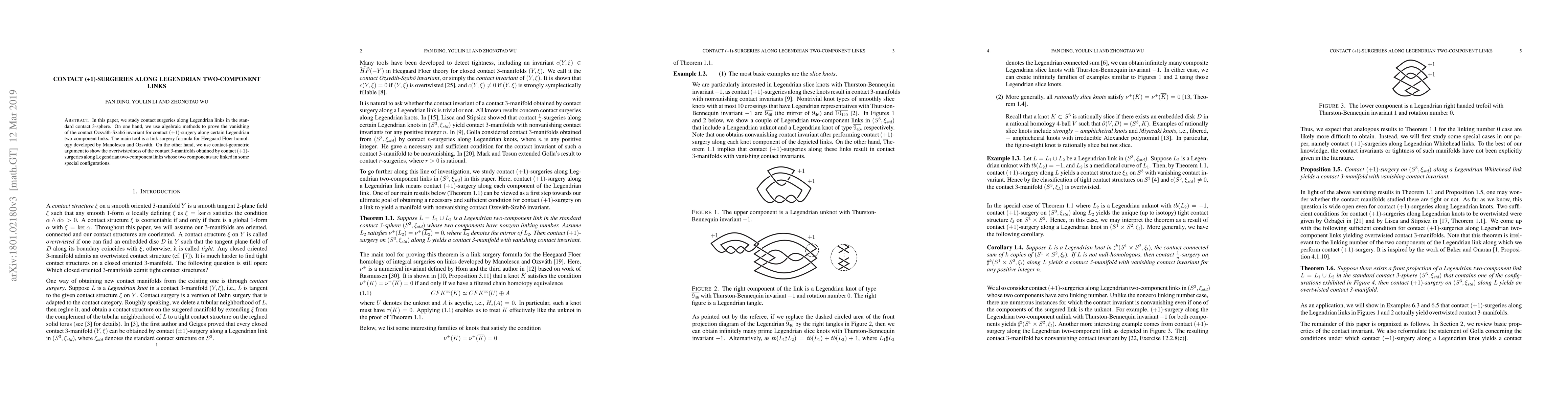 In this paper, we study contact surgeries along Legendrian links in the standard contact 3-sphere. On one hand, we use algebraic methods to prove the vanishing of the contact Ozsv\'{a}th-Szab\'{o} invariant for contact $(+1)$-surgery along certain Legendrian two-component links. The main tool is a link surgery formula for Heegaard Floer homology developed by Manolescu and Ozsv\'{a}th. On the other hand, we use contact-geometric argument to show the overtwistedness of the contact 3-manifolds obtained by contact $(+1)$-surgeries along Legendrian two-component links whose two components are linked in some special configurations.