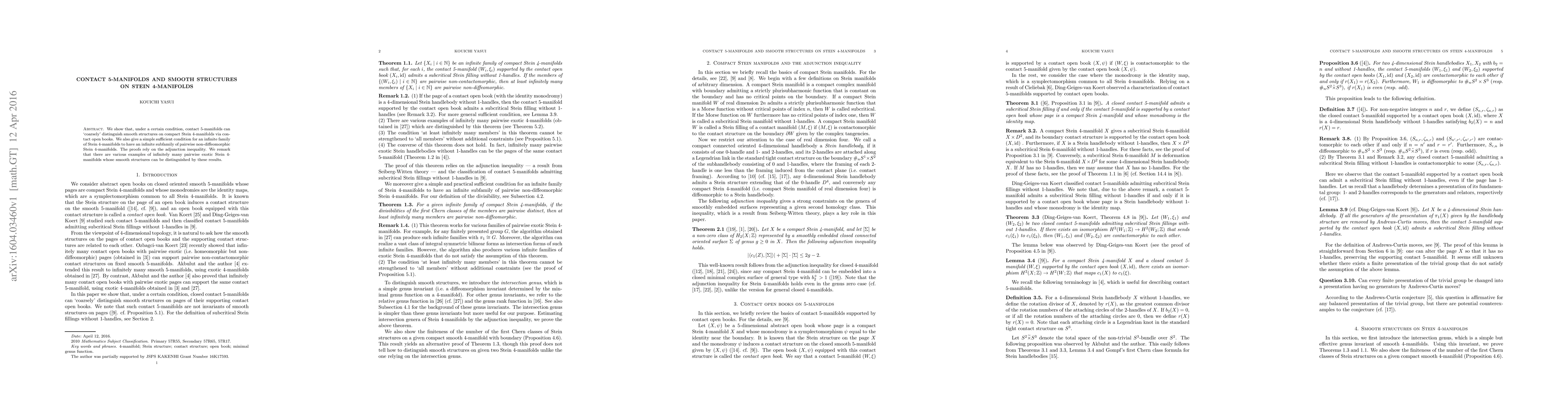 This paper demonstrates that specific contact 5-manifolds can distinguish smooth structures on compact Stein 4-manifolds through contact open books, under certain conditions. It also provides a condition for an infinite family of Stein 4-manifolds to include an infinite subfamily of pairwise non-diffeomorphic structures, relying on the adjunction inequality.