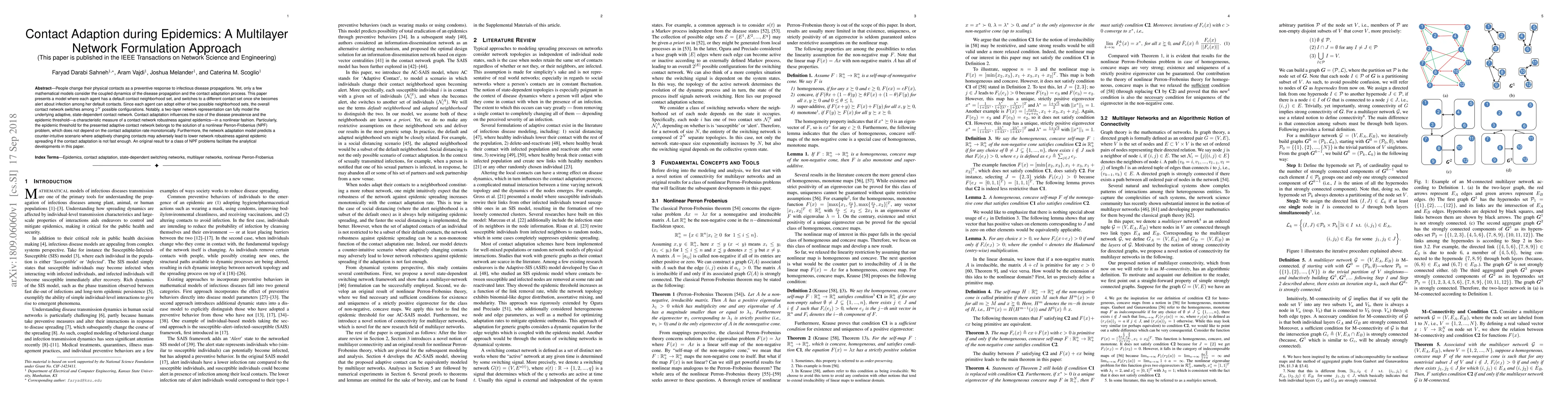 People change their physical contacts as a preventive response to infectious disease propagations. Yet, only a few mathematical models consider the coupled dynamics of the disease propagation and the contact adaptation process. This paper presents a model where each agent has a default contact neighborhood set, and switches to a different contact set once she becomes alert about infection among her default contacts. Since each agent can adopt either of two possible neighborhood sets, the overall contact network switches among 2^N possible configurations. Notably, a two-layer network representation can fully model the underlying adaptive, state-dependent contact network. Contact adaptation influences the size of the disease prevalence and the epidemic threshold---a characteristic measure of a contact network robustness against epidemics---in a nonlinear fashion. Particularly, the epidemic threshold for the presented adaptive contact network belongs to the solution of a nonlinear Perron-Frobenius (NPF) problem, which does not depend on the contact adaptation rate monotonically. Furthermore, the network adaptation model predicts a counter-intuitive scenario where adaptively changing contacts may adversely lead to lower network robustness against epidemic spreading if the contact adaptation is not fast enough. An original result for a class of NPF problems facilitate the analytical developments in this paper.