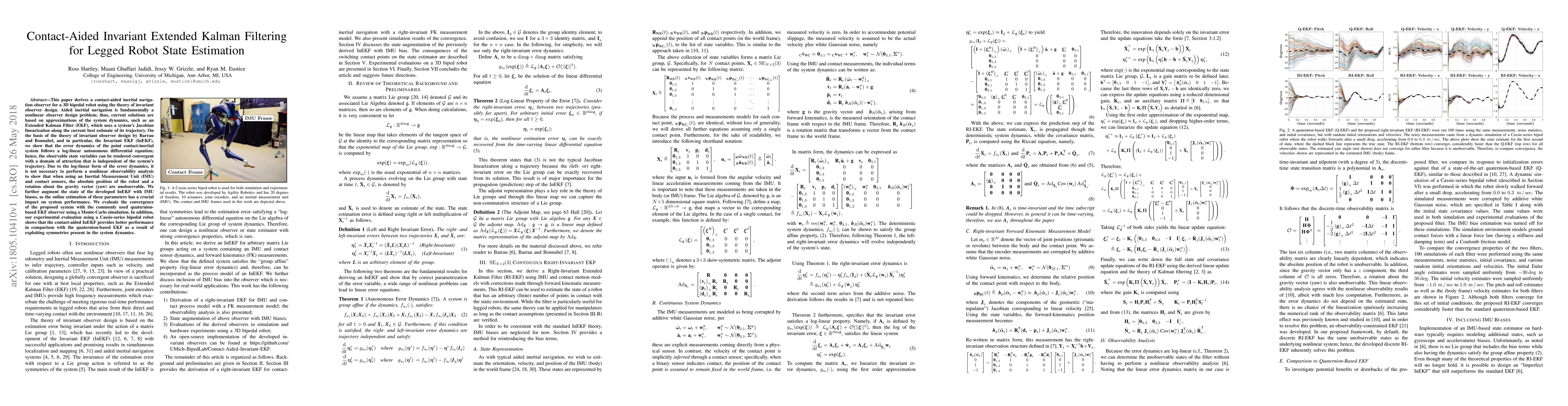 This paper derives a contact-aided inertial navigation observer for a 3D bipedal robot using the theory of invariant observer design. Aided inertial navigation is fundamentally a nonlinear observer design problem; thus, current solutions are based on approximations of the system dynamics, such as an Extended Kalman Filter (EKF), which uses a system's Jacobian linearization along the current best estimate of its trajectory. On the basis of the theory of invariant observer design by Barrau and Bonnabel, and in particular, the Invariant EKF (InEKF), we show that the error dynamics of the point contact-inertial system follows a log-linear autonomous differential equation; hence, the observable state variables can be rendered convergent with a domain of attraction that is independent of the system's trajectory. Due to the log-linear form of the error dynamics, it is not necessary to perform a nonlinear observability analysis to show that when using an Inertial Measurement Unit (IMU) and contact sensors, the absolute position of the robot and a rotation about the gravity vector (yaw) are unobservable. We further augment the state of the developed InEKF with IMU biases, as the online estimation of these parameters has a crucial impact on system performance. We evaluate the convergence of the proposed system with the commonly used quaternion-based EKF observer using a Monte-Carlo simulation. In addition, our experimental evaluation using a Cassie-series bipedal robot shows that the contact-aided InEKF provides better performance in comparison with the quaternion-based EKF as a result of exploiting symmetries present in the system dynamics.