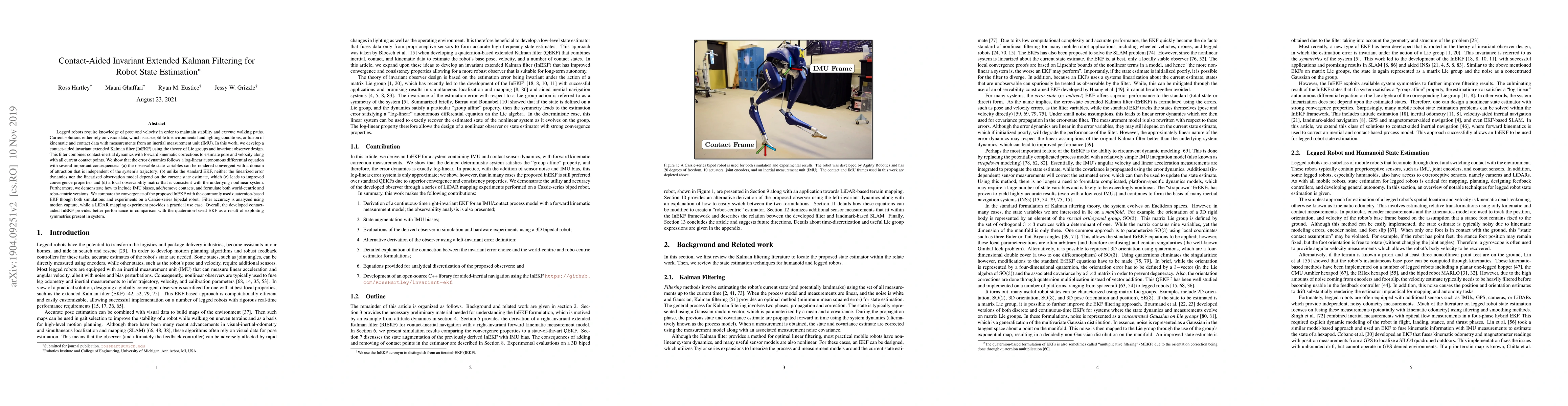 This paper proposes a contact-aided invariant extended Kalman filter (InEKF) for legged robot state estimation using Lie groups and invariant observer design. The InEKF combines contact-inertial dynamics with forward kinematic corrections, leading to improved convergence properties and better performance compared to the quaternion-based EKF, as demonstrated through simulations and experiments on a Cassie-series bipedal robot.