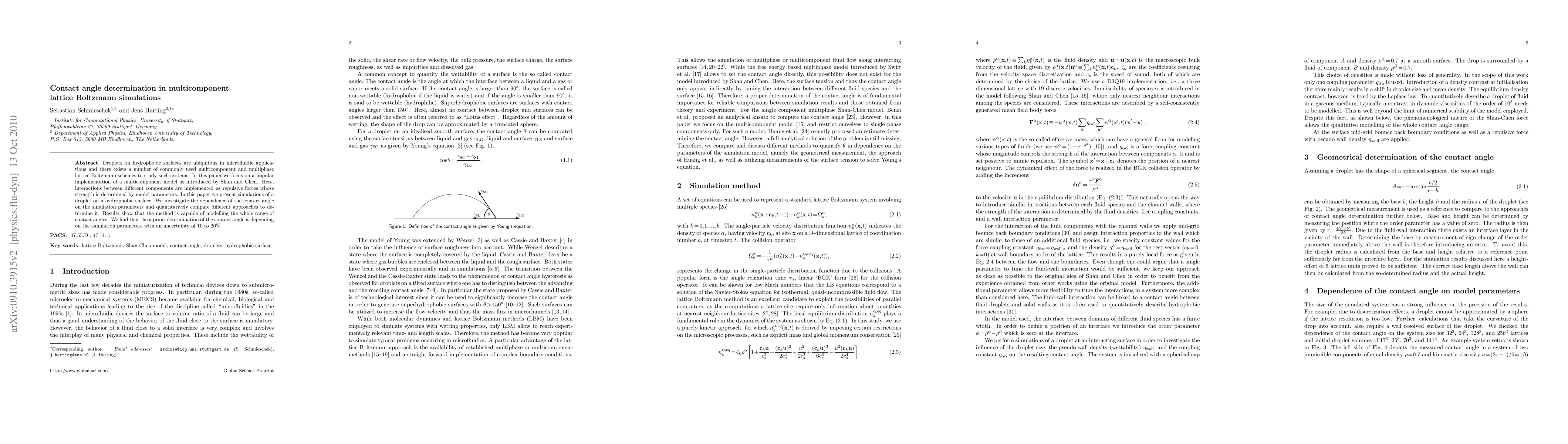 This paper examines the use of Shan and Chen's multicomponent lattice Boltzmann model to simulate droplets on hydrophobic surfaces, determining contact angles through various methods. It finds that contact angle predictions are influenced by simulation parameters, with an uncertainty range of 10-20%.