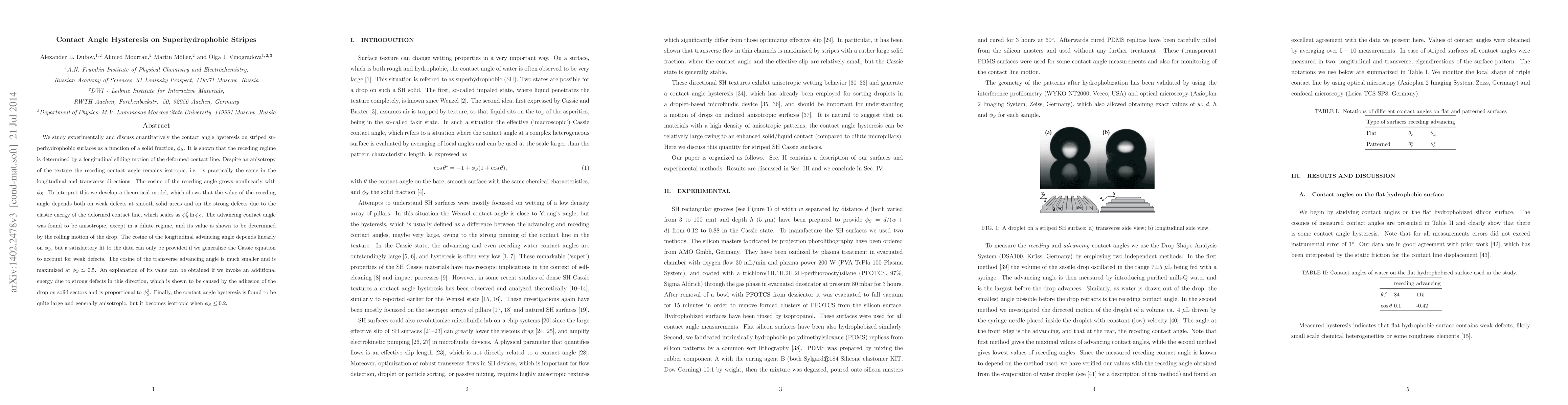 This study investigates experimentally and theoretically the contact angle hysteresis on striped superhydrophobic surfaces, revealing that the receding contact angle depends on both weak defects and the elastic energy of strong defects, while the advancing angle is anisotropic and influenced by rolling motion and additional defect-induced energy. Contact angle hysteresis is generally anisotropic but becomes isotropic at low solid fractions.